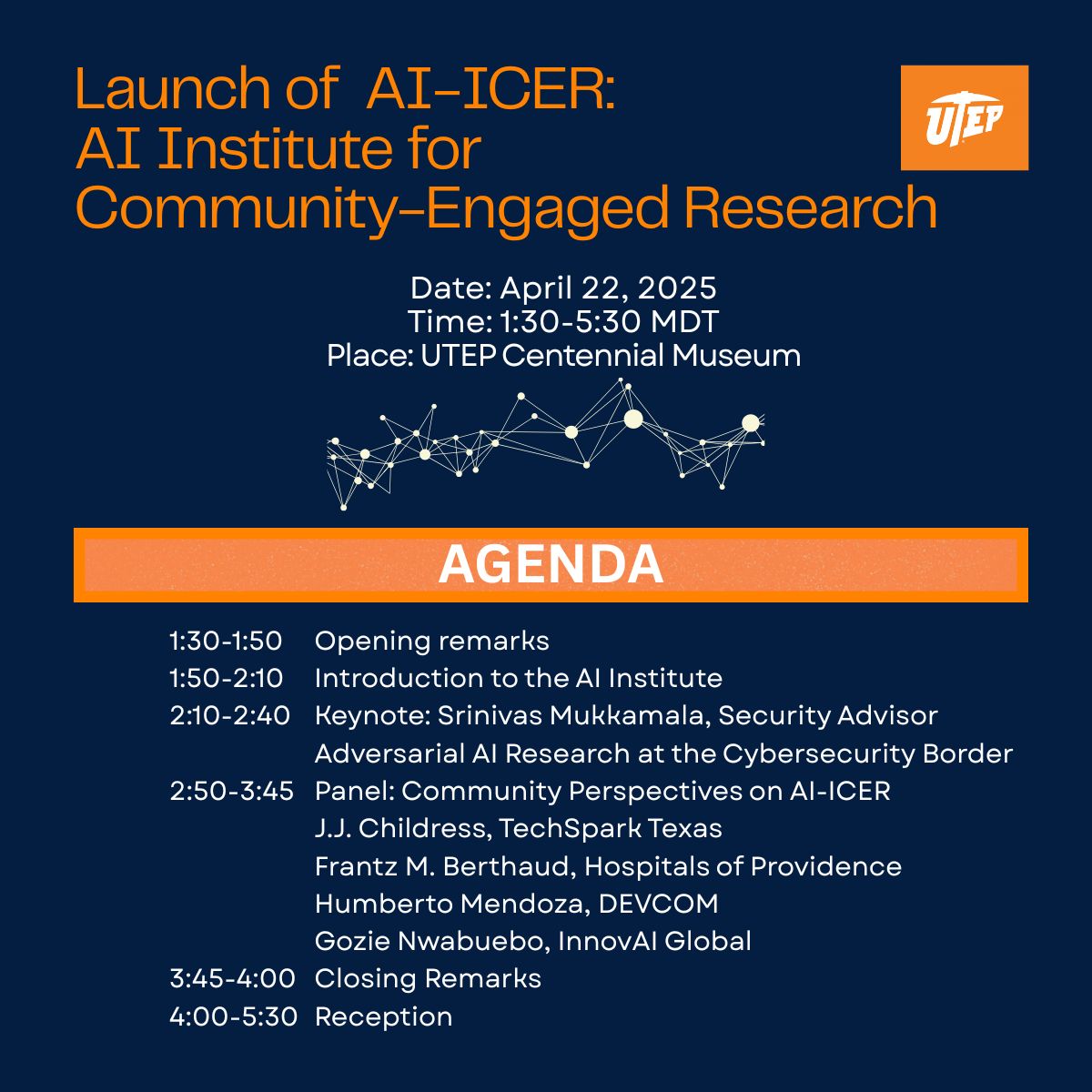 Join us for the launch of UTEP’s AI Institute for Community-Engaged Research (AI-ICER)—a dynamic new think tank established through the UT System Regents’ Research Excellence Program. This event brings together interdisciplinary researchers, educators, public and private sector leaders, and industry partners committed to addressing regional and national challenges through the integration of AI. Learn about the mission and future of the institute, connect with faculty and community members, and hear from leaders on how AI is transforming health, education, and communities. The celebration will take place on April 22, 2025, from 1:30–4:00 PM at the UTEP Centennial Museum, followed by a reception from 4:00–5:30 PM.
