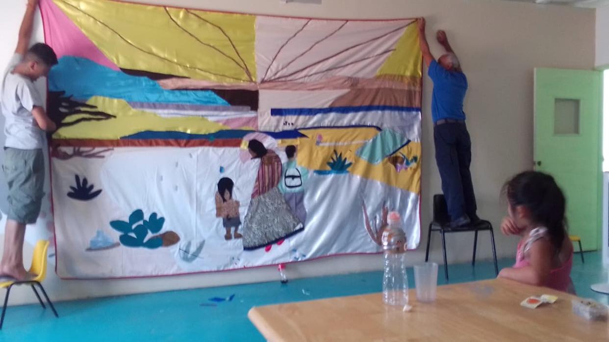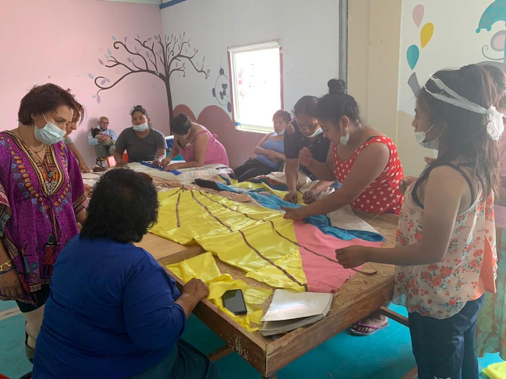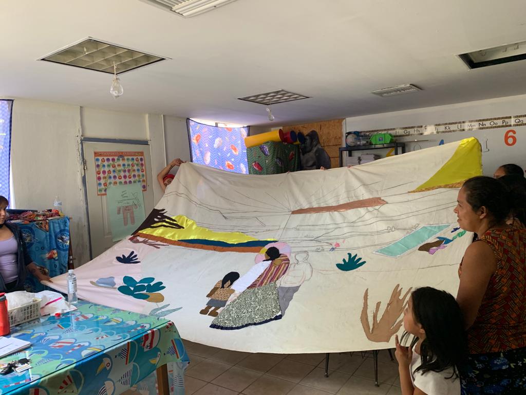 Members of the Huellas Sewing Workshop created the La Familia Tapestry in a Juárez migrant shelter during the spring of 2021. The workshop's co-founders and attendees discussed their immigrant experiences, their time spent taking part in the sewing workshop, and their hopes and dreams for the future.