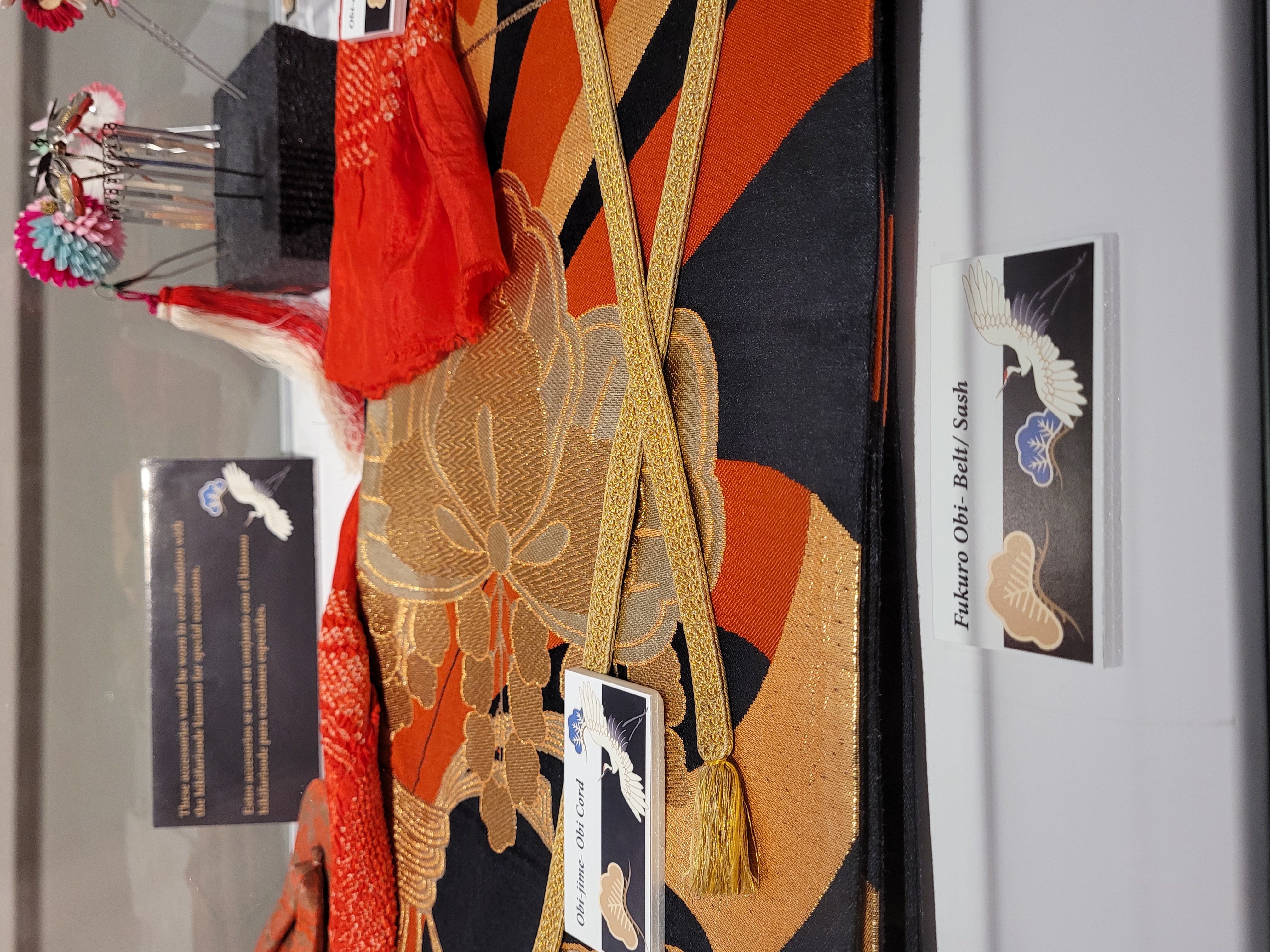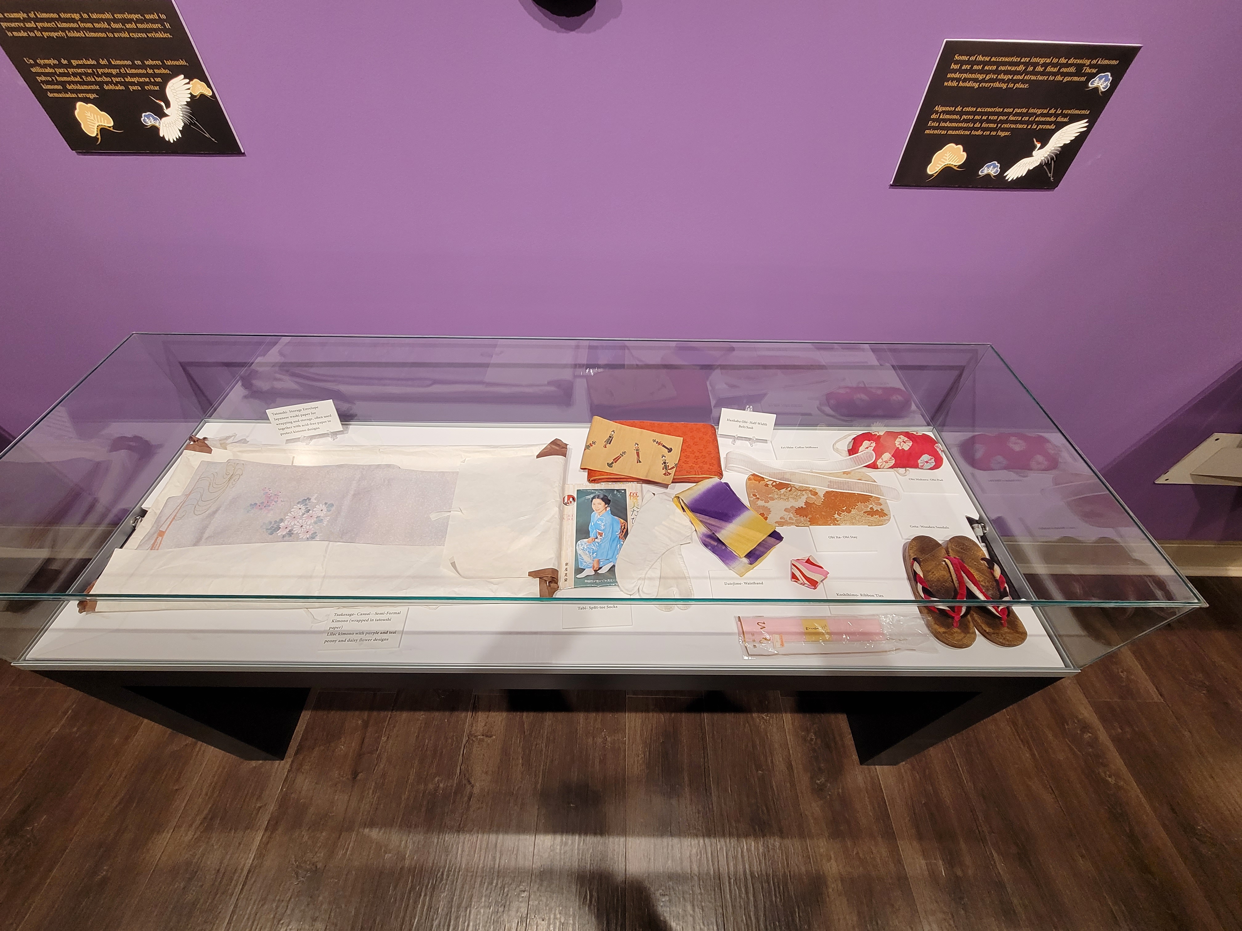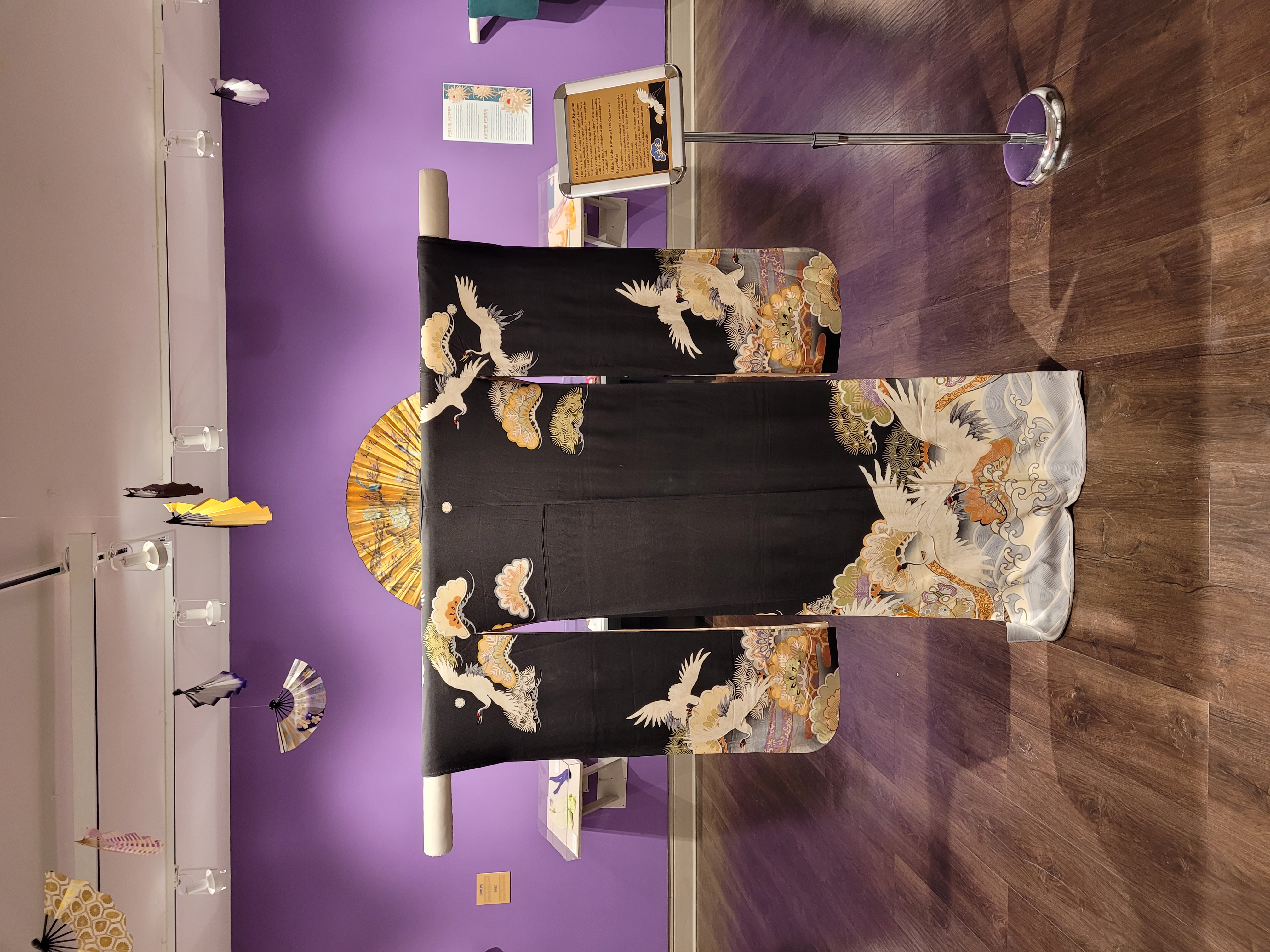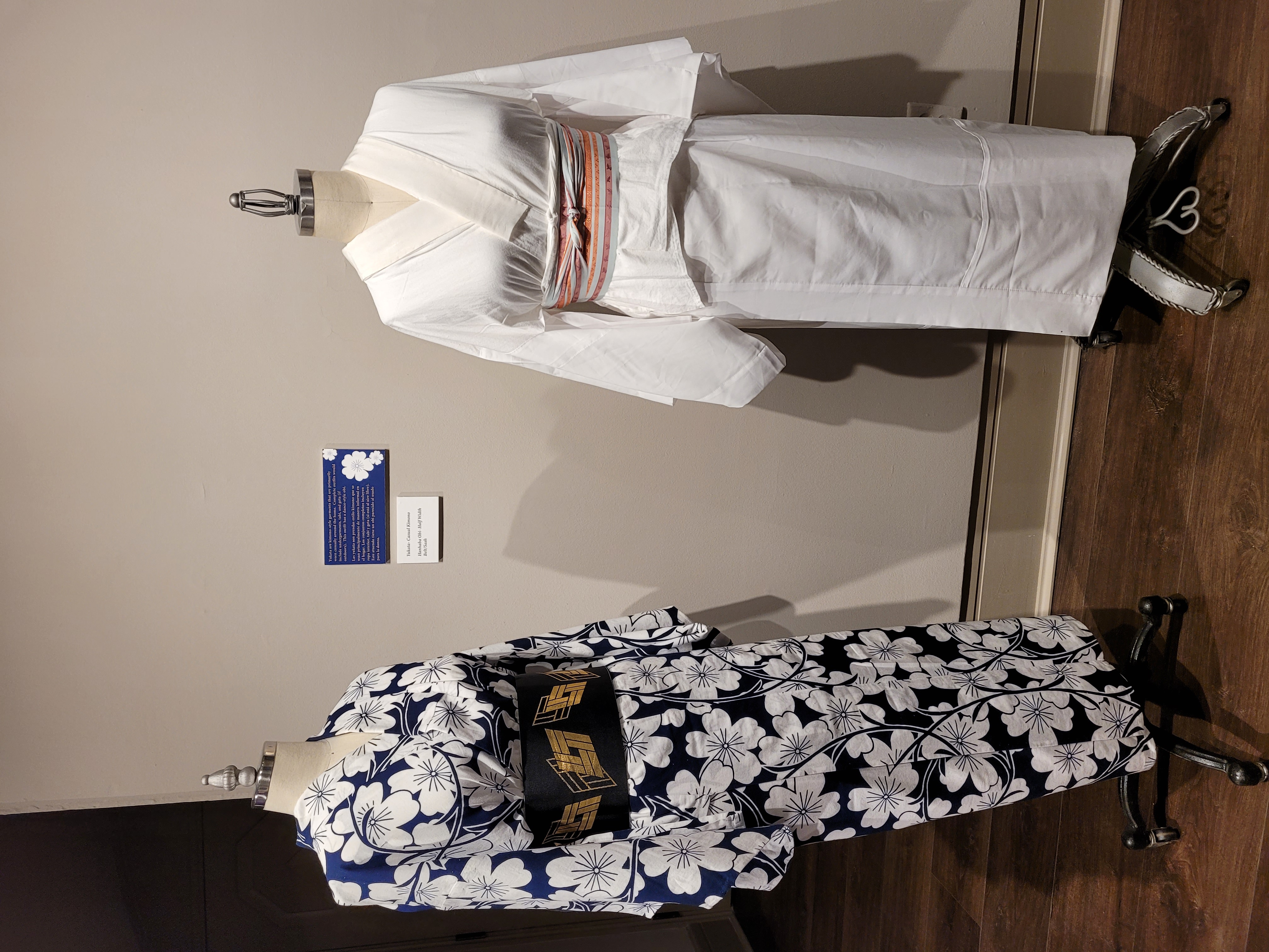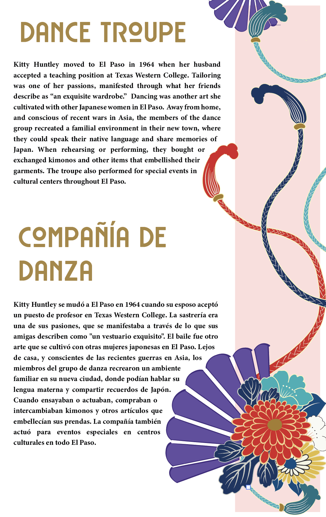 In 2016, the UTEP Theater Department received a large donation of kimonos, accessories, and performance videos that belonged to Katsuko "Kitty" Huntley. Mrs. Huntley, who grew up in Japan, married an American G.I., immigrated to the United States in 1952, and eventually settled in El Paso. While we know little about Mrs. Huntley and how she acquired these objects, this unexpected inheritance gives us a glimpse into a previously unknown life. In her videos, Kitty appears in kimono with her dance group. Their dance performances tell stories from a home across the world. We can speculate that her collection of kimonos and the dances that she performed provided a connection to Japan, her life prior to immigrating to the United States, and the Japanese- American community here in El Paso. It was this story that inspired us to title the exhibit Ties to Home: The Kimonos of Kitty Huntley.