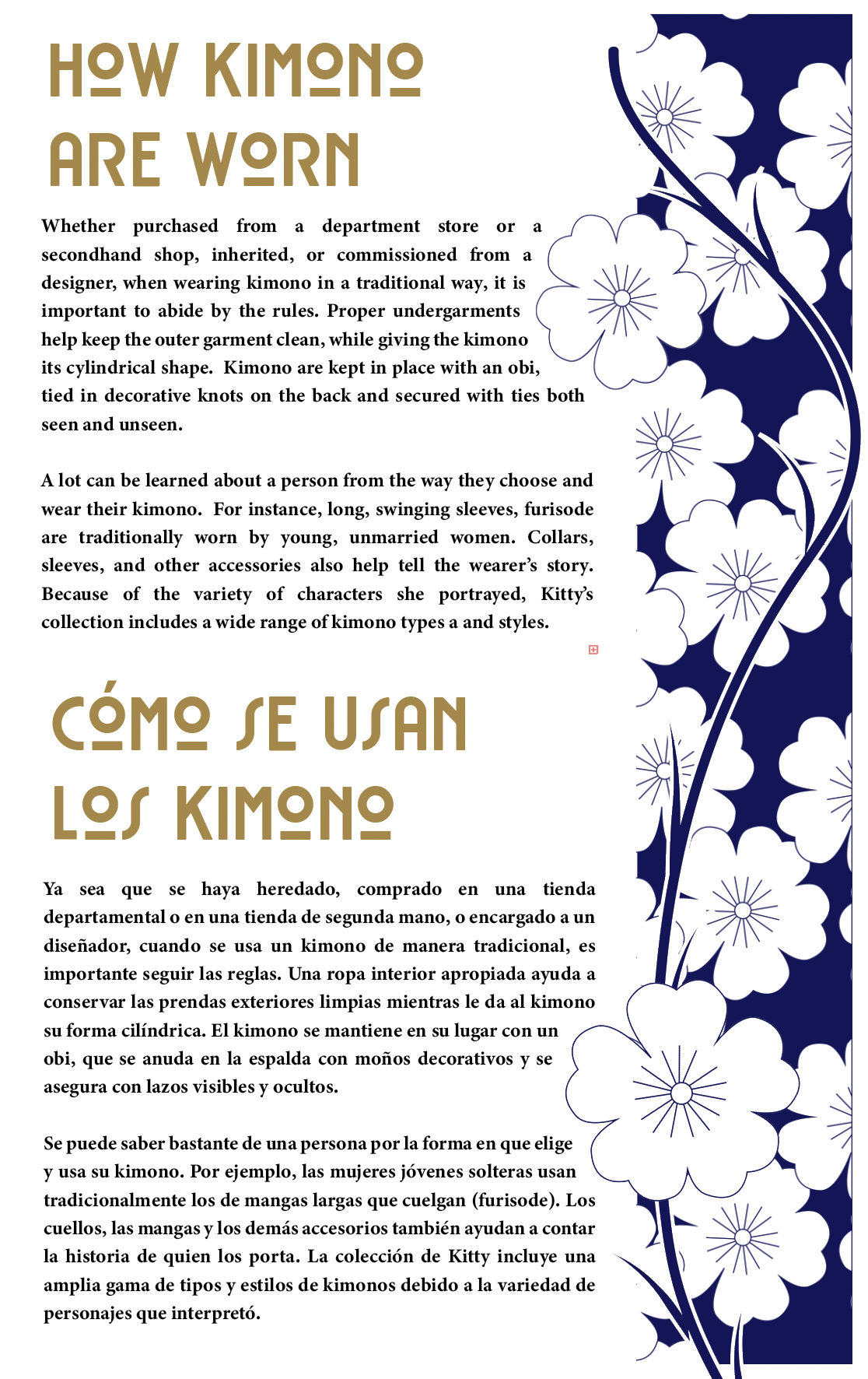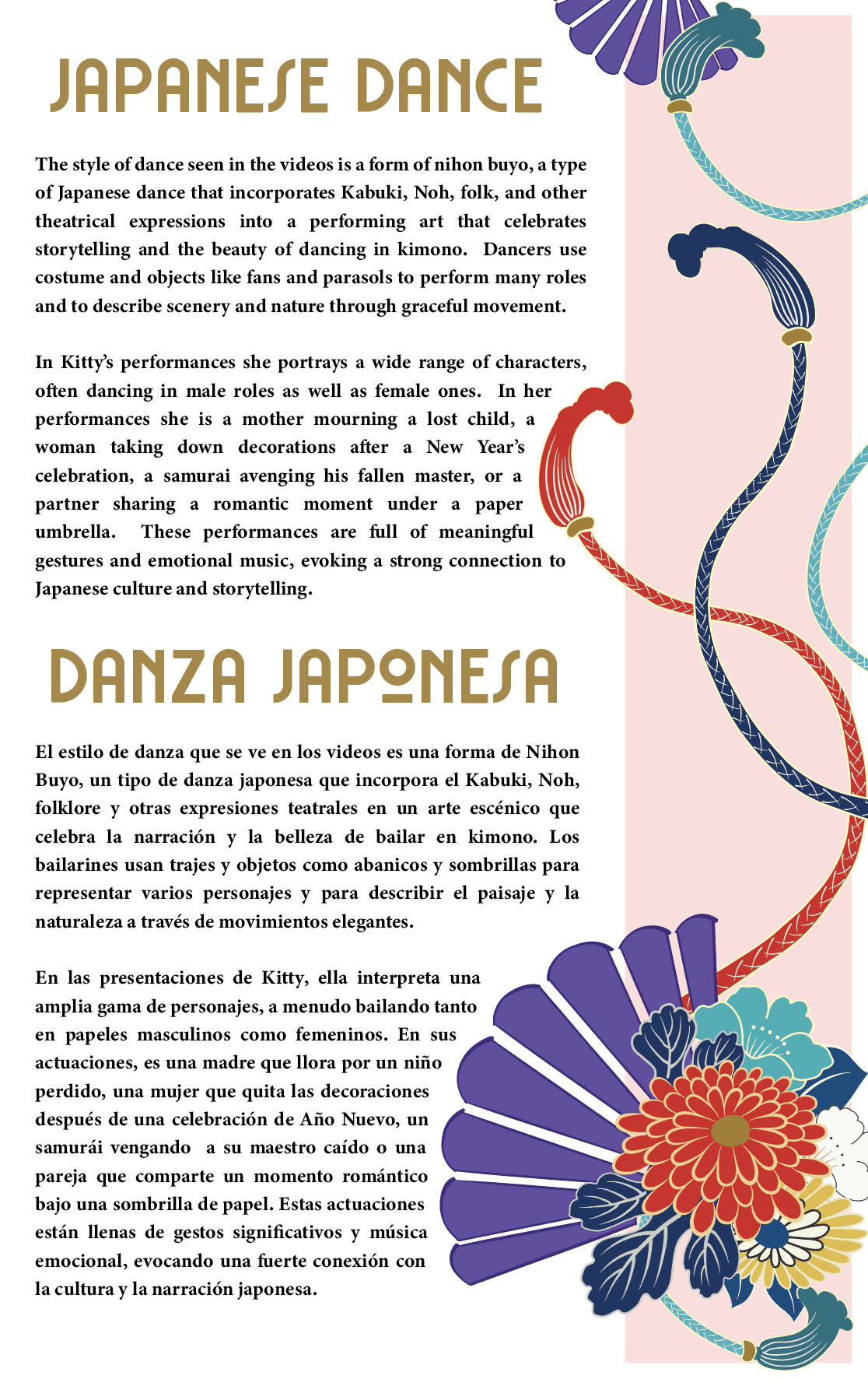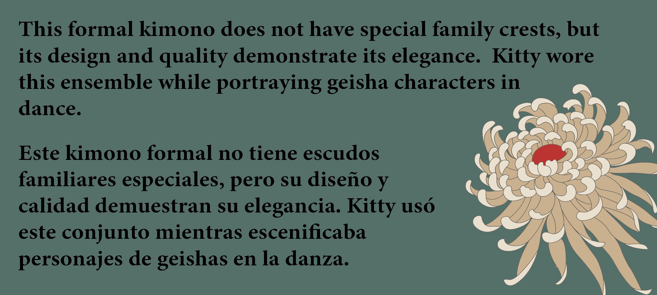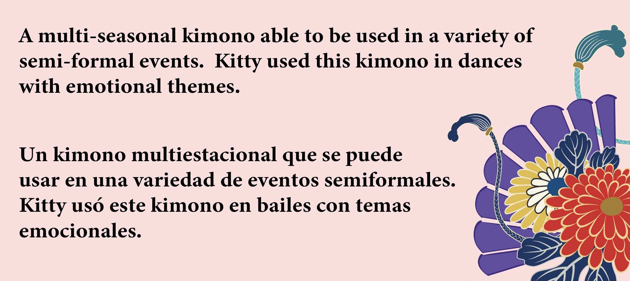 In 2016, the UTEP Theater Department received a large donation of kimonos, accessories, and performance videos that belonged to Katsuko "Kitty" Huntley. Mrs. Huntley, who grew up in Japan, married an American G.I., immigrated to the United States in 1952, and eventually settled in El Paso. While we know little about Mrs. Huntley and how she acquired these objects, this unexpected inheritance gives us a glimpse into a previously unknown life. In her videos, Kitty appears in kimono with her dance group. Their dance performances tell stories from a home across the world. We can speculate that her collection of kimonos and the dances that she performed provided a connection to Japan, her life prior to immigrating to the United States, and the Japanese- American community here in El Paso. It was this story that inspired us to title the exhibit Ties to Home: The Kimonos of Kitty Huntley.