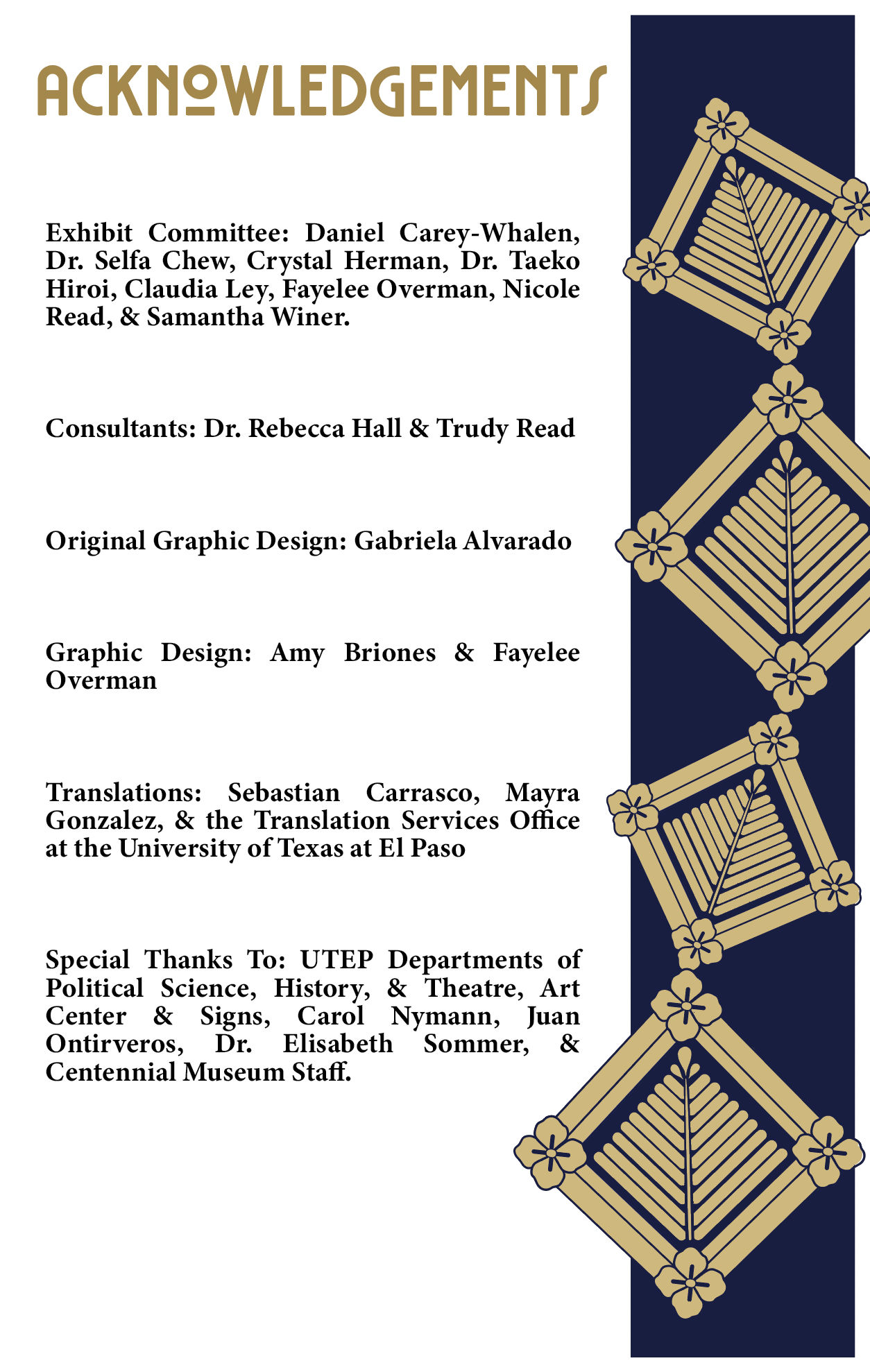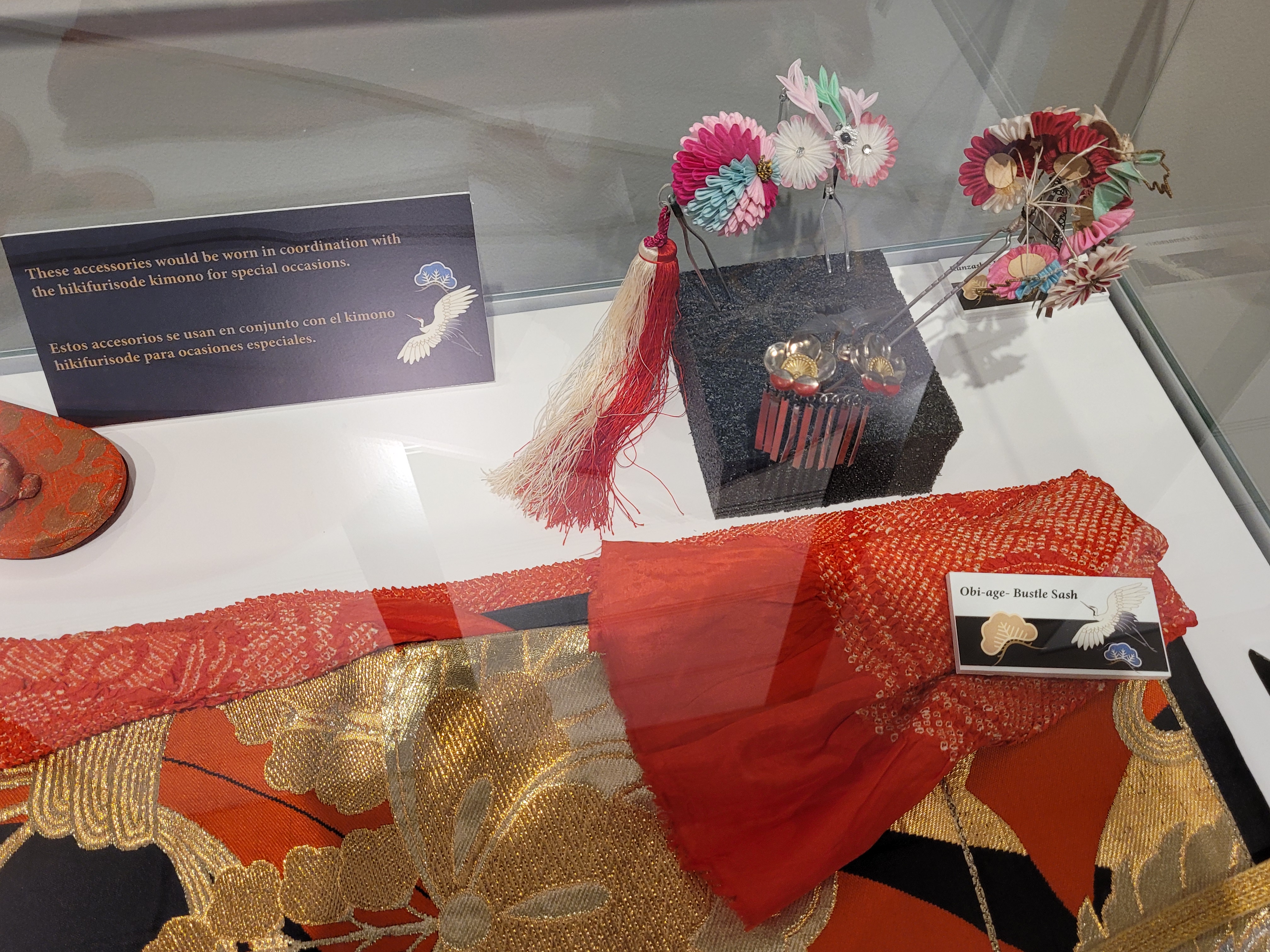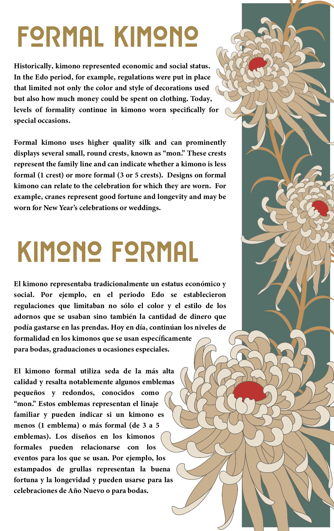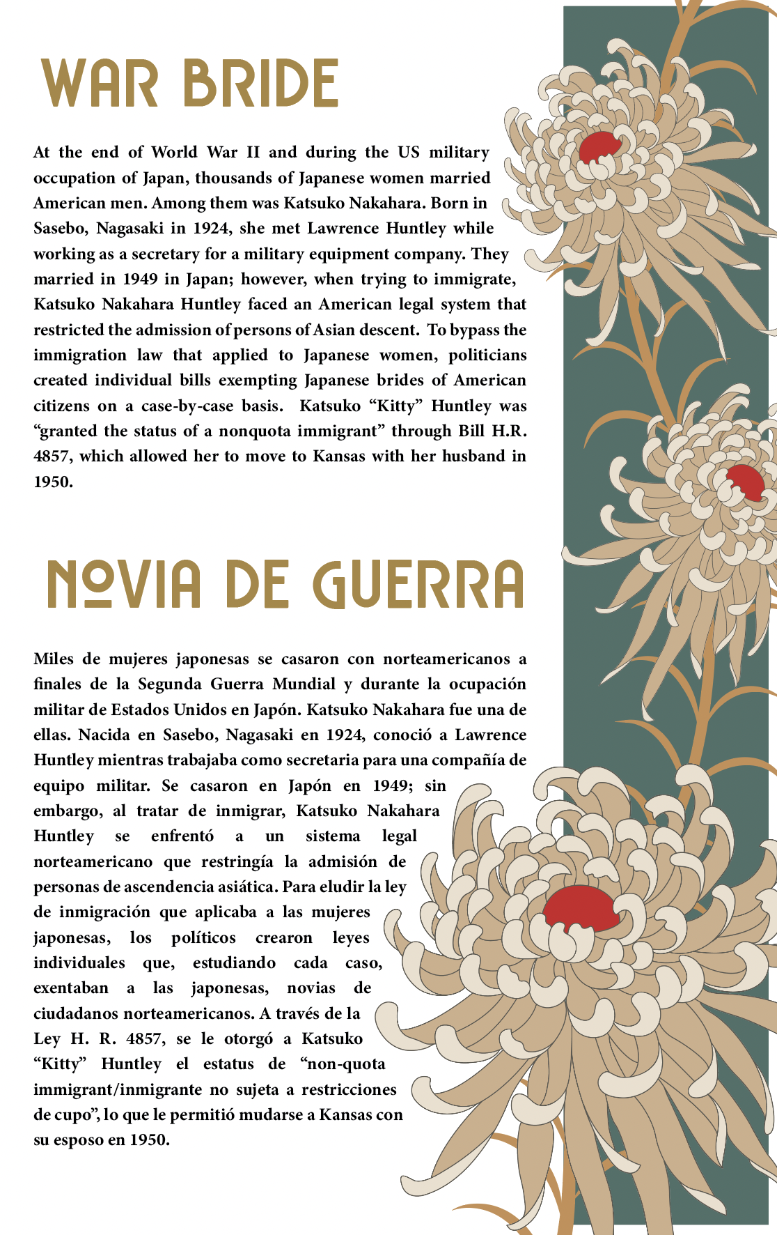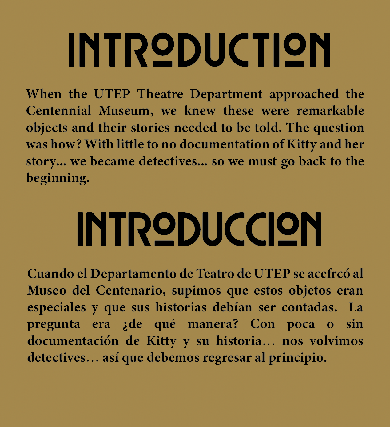 In 2016, the UTEP Theater Department received a large donation of kimonos, accessories, and performance videos that belonged to Katsuko "Kitty" Huntley. Mrs. Huntley, who grew up in Japan, married an American G.I., immigrated to the United States in 1952, and eventually settled in El Paso. While we know little about Mrs. Huntley and how she acquired these objects, this unexpected inheritance gives us a glimpse into a previously unknown life. In her videos, Kitty appears in kimono with her dance group. Their dance performances tell stories from a home across the world. We can speculate that her collection of kimonos and the dances that she performed provided a connection to Japan, her life prior to immigrating to the United States, and the Japanese- American community here in El Paso. It was this story that inspired us to title the exhibit Ties to Home: The Kimonos of Kitty Huntley.