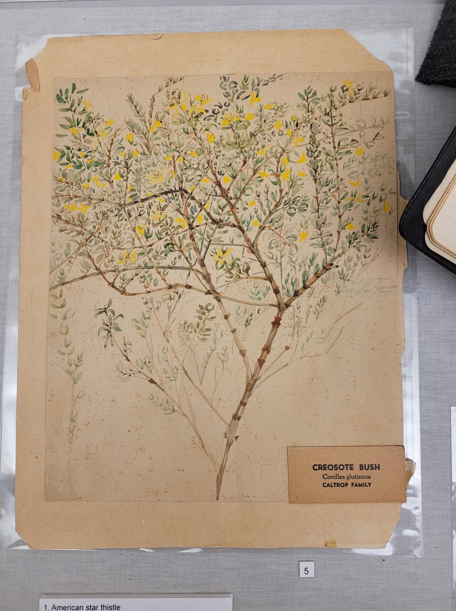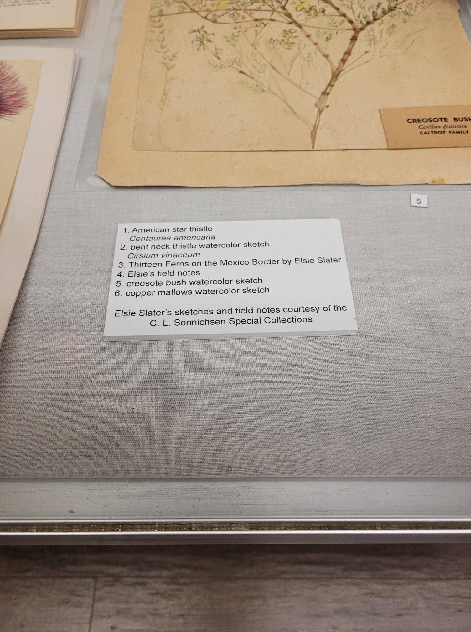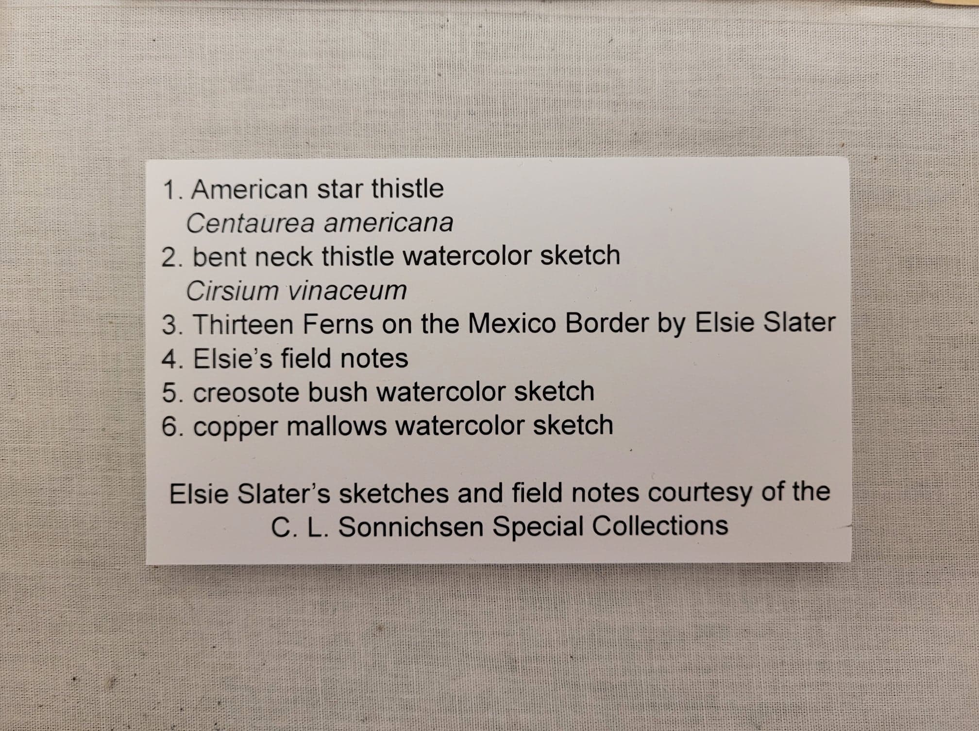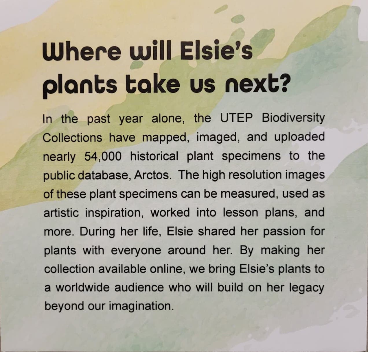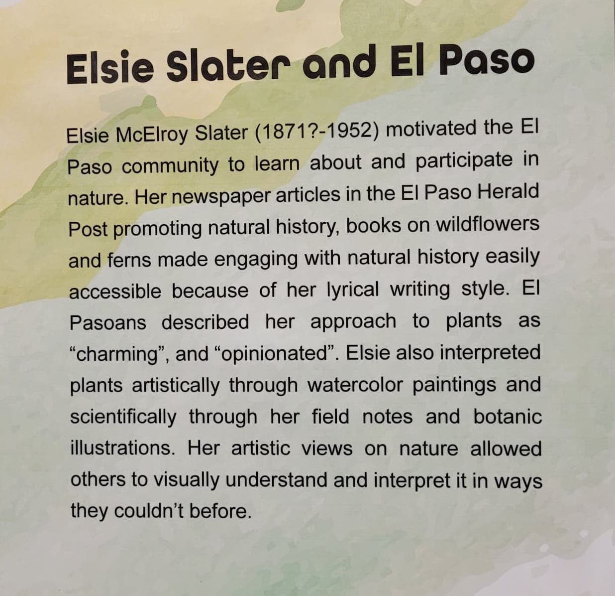 Elsie Slater, a self-taught biologist, is recognized as the first El Pasoan to build a collection of pressed plants of the region's flora, During her life, Elsie encouraged her community to appreciate and conserve natural history through her writings, art, and collecting trups with friends. After her death in 1952, Elsie's son donated her papers, paintings, and plant collections to various institutions at UTEP, including what would become the UTEP Biodiversity Collections. Elsie's collections form the oldest preserved plants to have been both collected and stored locally. Her work is impressive for its various artistic and scientific approaches. Elsie's distinct perspective on the Chihuahua Desert continues to inspires us to engage with the plants we pass by every day.