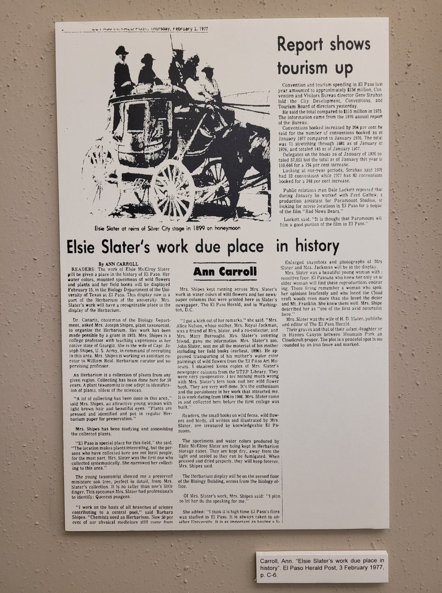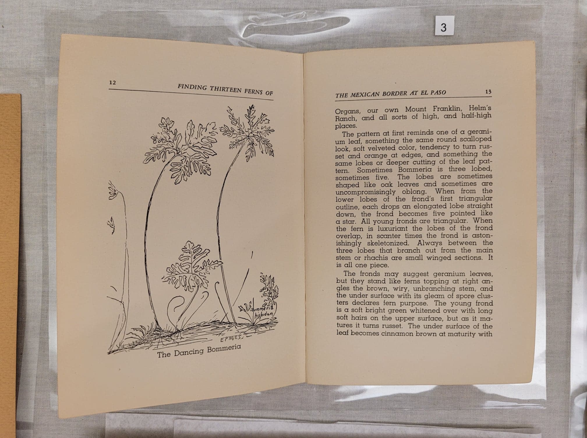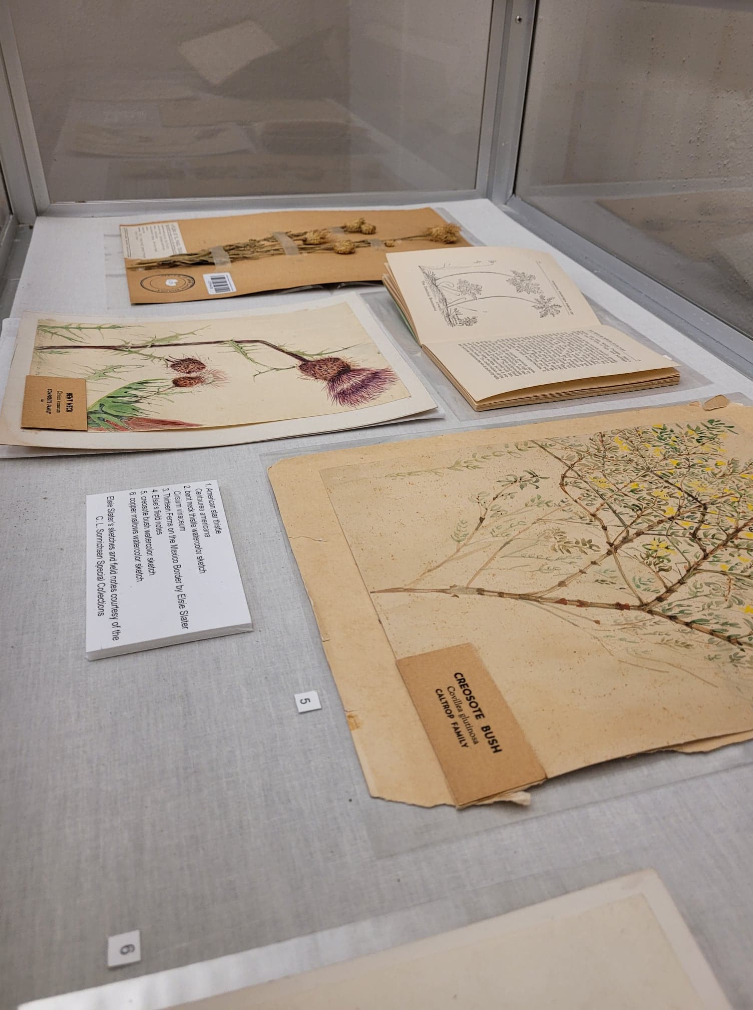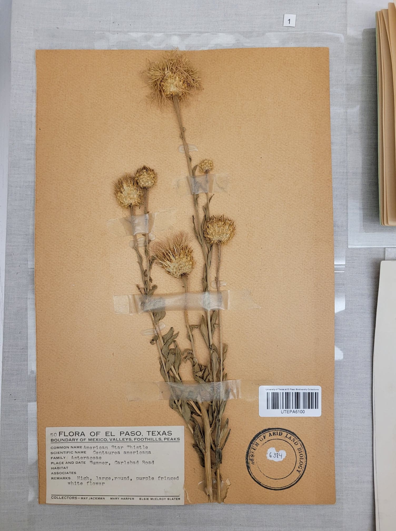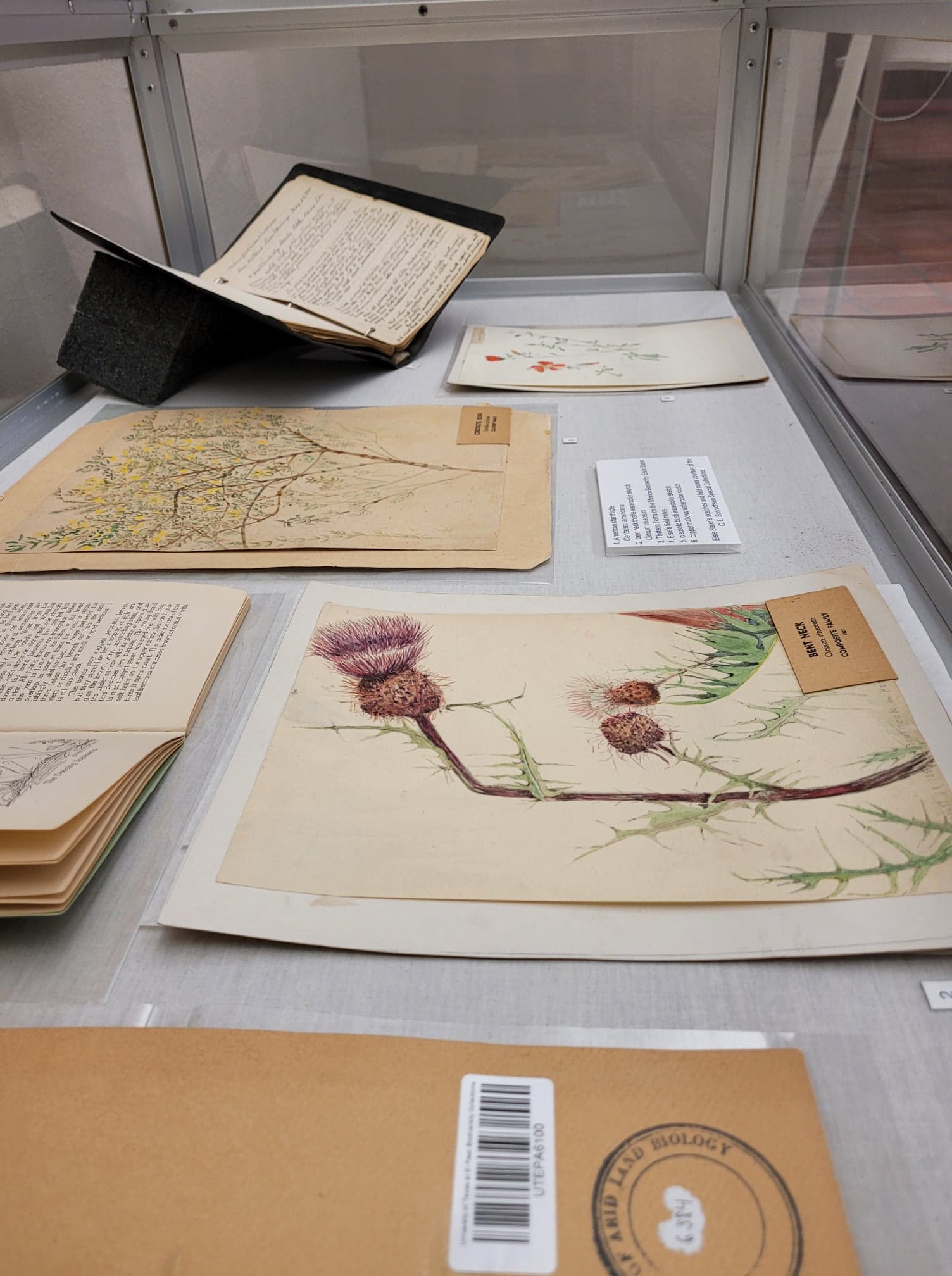 Elsie Slater, a self-taught biologist, is recognized as the first El Pasoan to build a collection of pressed plants of the region's flora, During her life, Elsie encouraged her community to appreciate and conserve natural history through her writings, art, and collecting trups with friends. After her death in 1952, Elsie's son donated her papers, paintings, and plant collections to various institutions at UTEP, including what would become the UTEP Biodiversity Collections. Elsie's collections form the oldest preserved plants to have been both collected and stored locally. Her work is impressive for its various artistic and scientific approaches. Elsie's distinct perspective on the Chihuahua Desert continues to inspires us to engage with the plants we pass by every day.