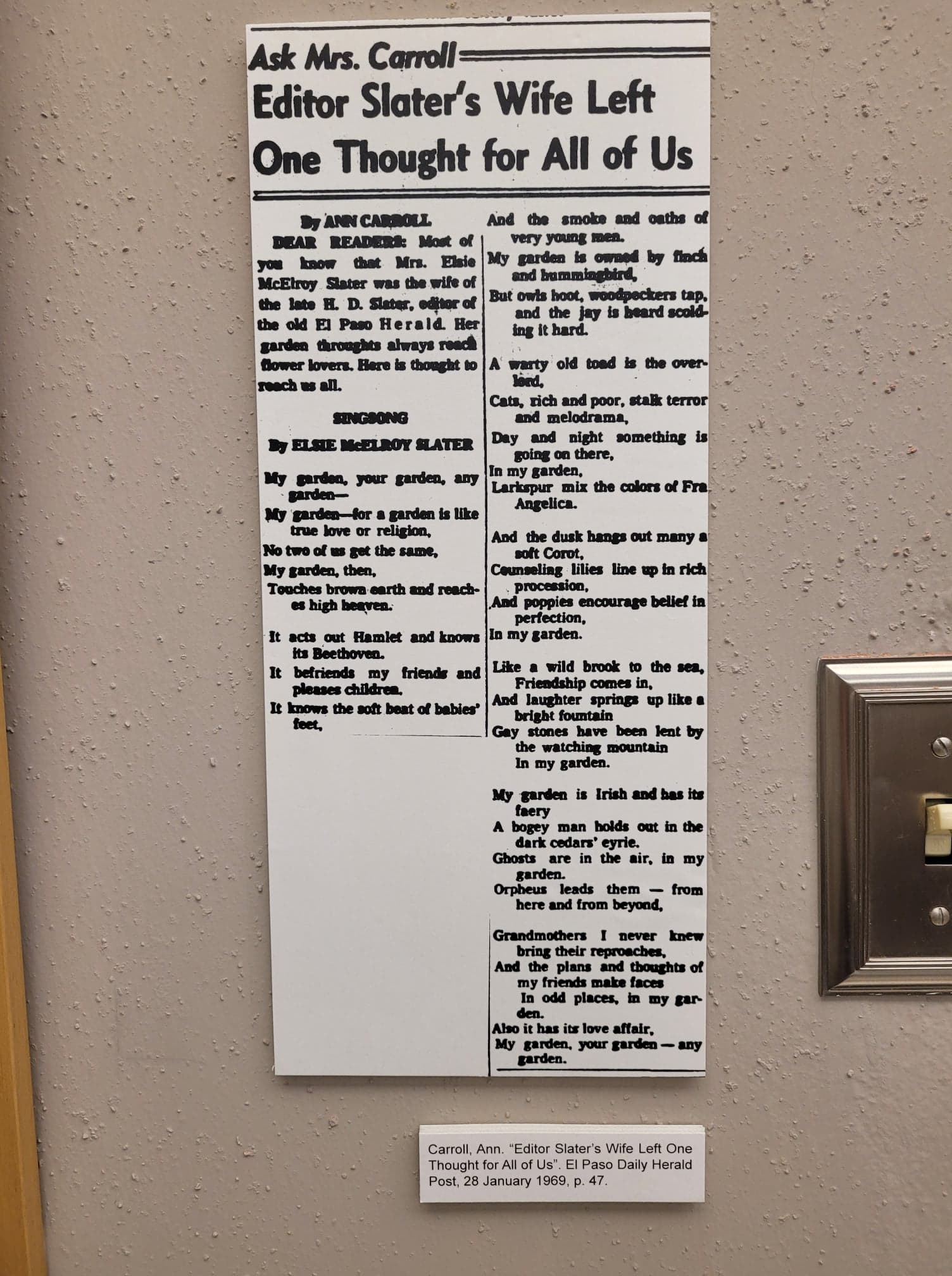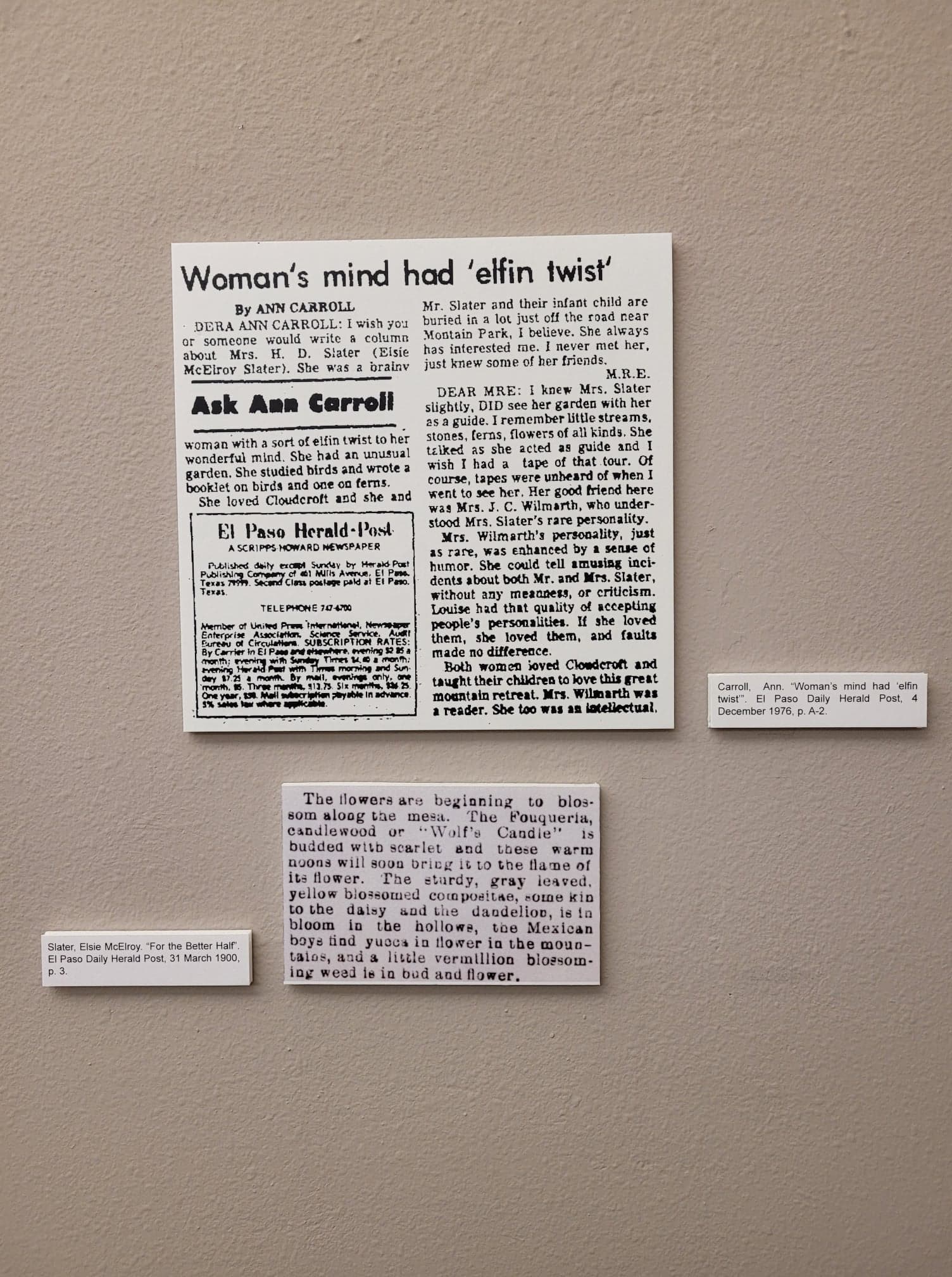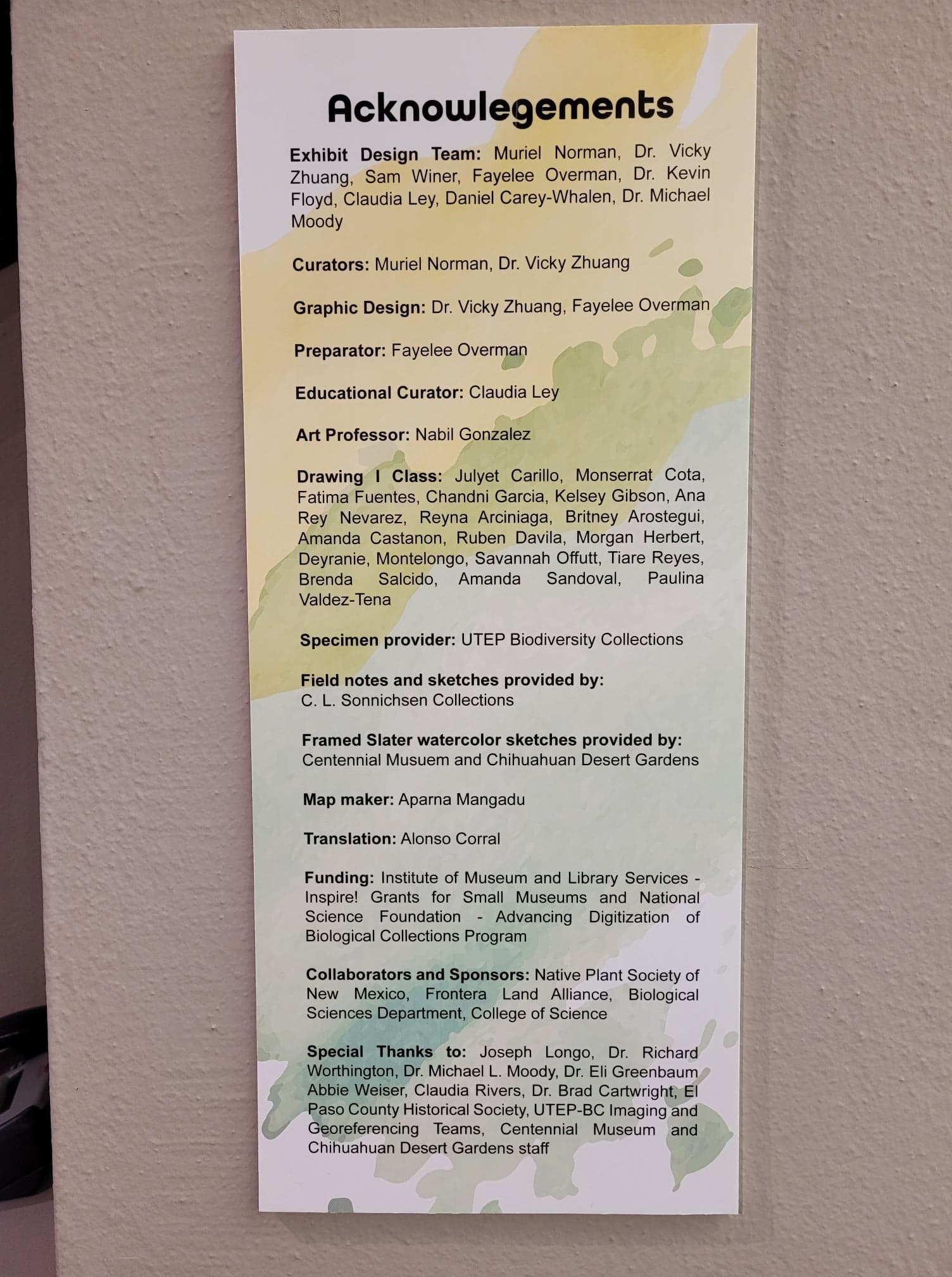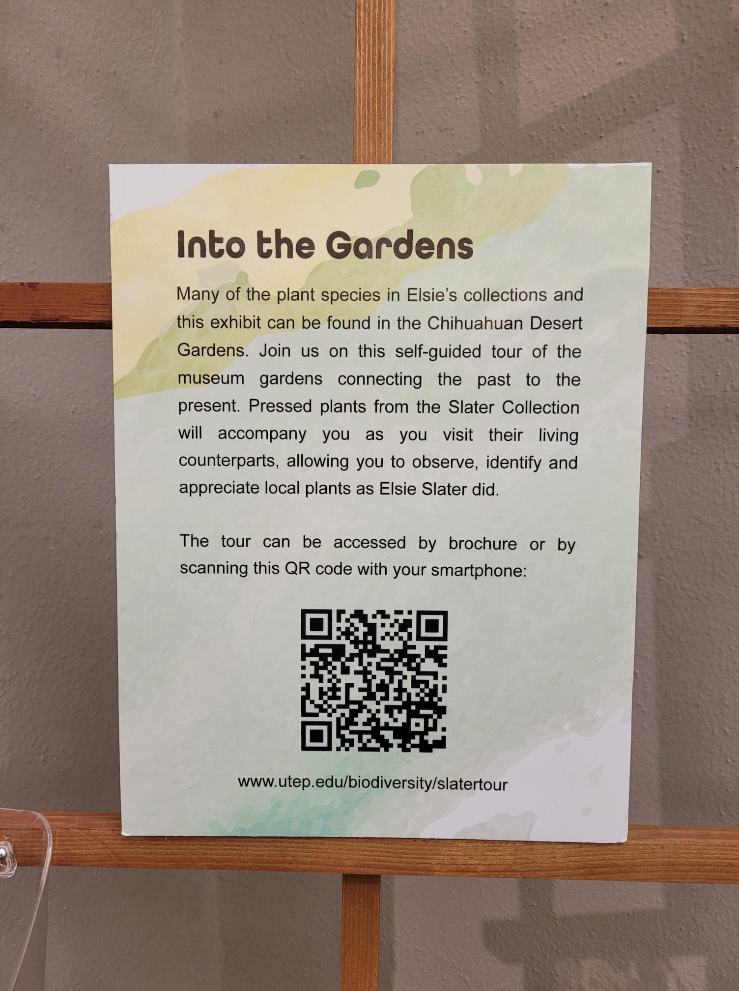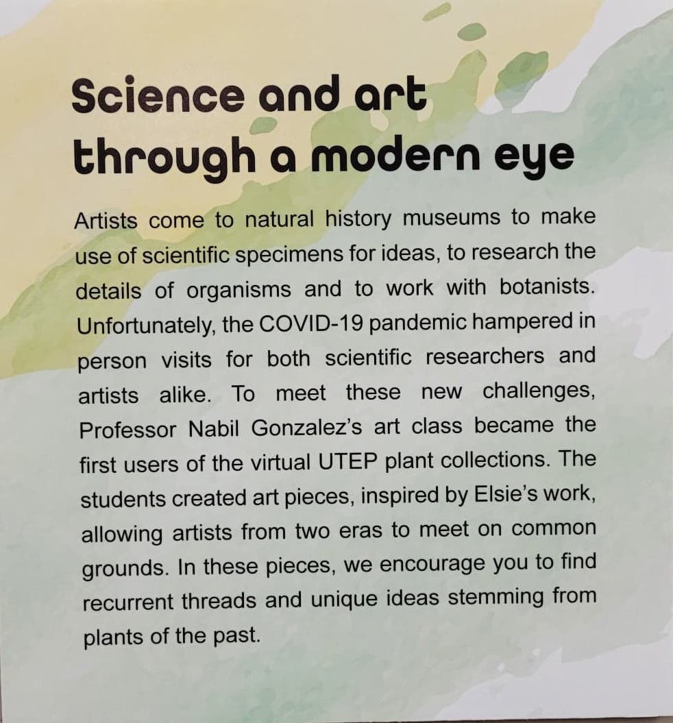 Elsie Slater, a self-taught biologist, is recognized as the first El Pasoan to build a collection of pressed plants of the region's flora, During her life, Elsie encouraged her community to appreciate and conserve natural history through her writings, art, and collecting trups with friends. After her death in 1952, Elsie's son donated her papers, paintings, and plant collections to various institutions at UTEP, including what would become the UTEP Biodiversity Collections. Elsie's collections form the oldest preserved plants to have been both collected and stored locally. Her work is impressive for its various artistic and scientific approaches. Elsie's distinct perspective on the Chihuahua Desert continues to inspires us to engage with the plants we pass by every day.