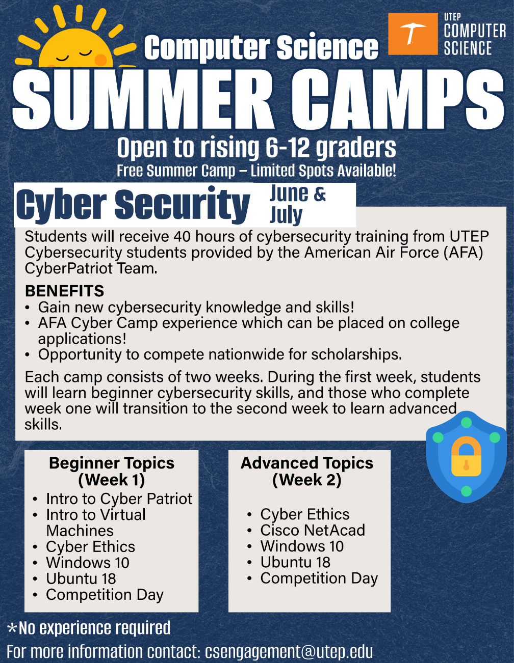 Students will receive 40 hours of FREE cybersecurity training led by UTEP cybersecurity students and based on curriculum provided by the Air Force Association (AFA) CyberPatriot Program.