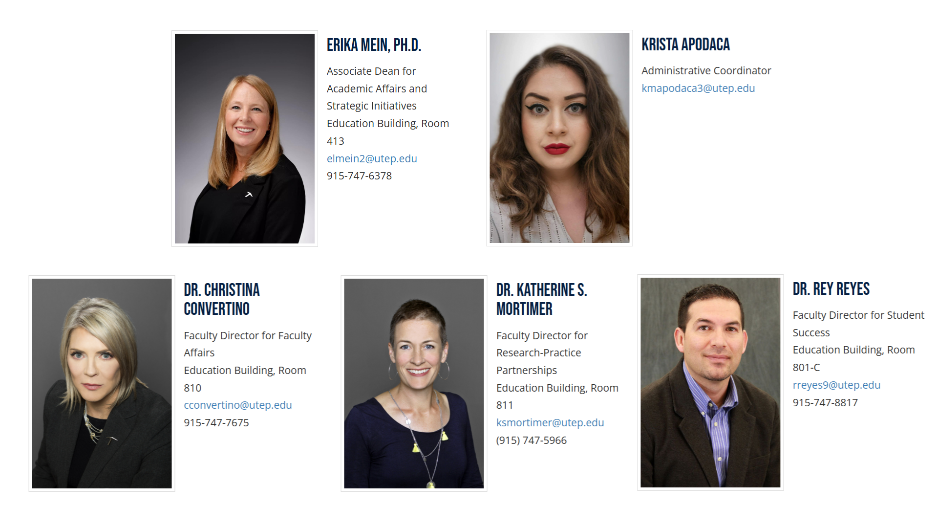 The UTEP College of Education’s Academic Affairs office is dedicated to fostering a culture of pedagogical innovation, student success, and research excellence.  The Academic Affairs team provides support in faculty development, mentoring, and professional growth, with a focus on innovative teaching, high-impact classroom practices, and data-driven strategies to enhance student retention.  The team also supports faculty in building their research agendas, navigating promotion and tenure processes, and contributing to the overall advancement of the college’s academic mission.