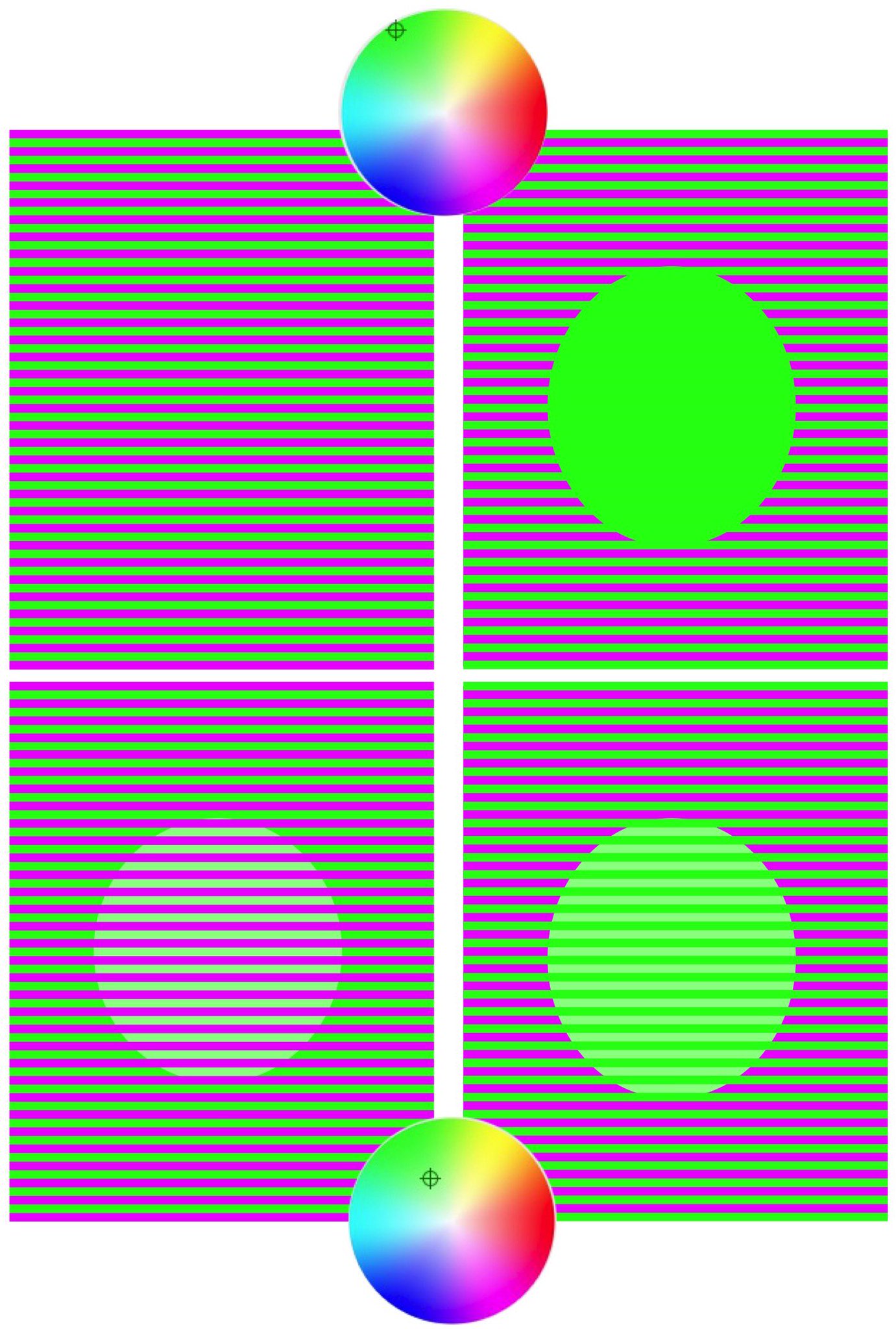 And with yellow target color, the relatively weak illusion with green/blue becomes much more vivid with green/violet. Modulo the target matching one of the foreground colors, the impact of the illusion appears to be a function of the differences between the foreground colors. |