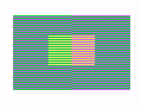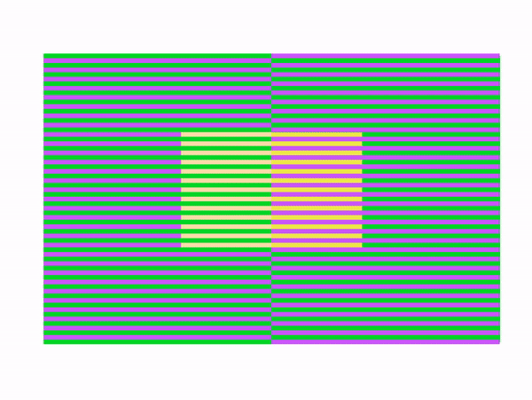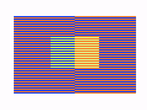 Here's a new kind of color illusion, based on the Munker illusion: the dynamic color-reversal illusion. I found this illusion while working on "reverse Munker" illusions. When I had the illusory colors as close to even as I could get them, I noticed that zooming in and out caused the colors to shift. You see Munker illusion colors when zoomed out and real colors when zoomed in. I note that these are very difficult to create. First, the effect is a function of the size of the displayed image. Second, it works only with the strongest of the Munker illusions, and even then the effect can be subtle. If you don't see it, try expanding or shrinking the image.