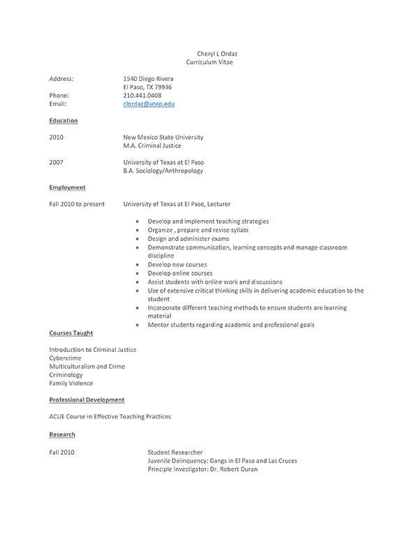 Cheryl Landeros earned a Master's degree in Criminal Justice from New Mexico State University. She is the Faculty Advisor for Lambda Epsilon Sigma, which is the UTEP Student Chapter for Criminal Justice majors. The UTEP chapter is part of the National Association called:Lambda Alpha Epsilon. Ms. Ordaz previously served as the Faculty Senator for the Department.
