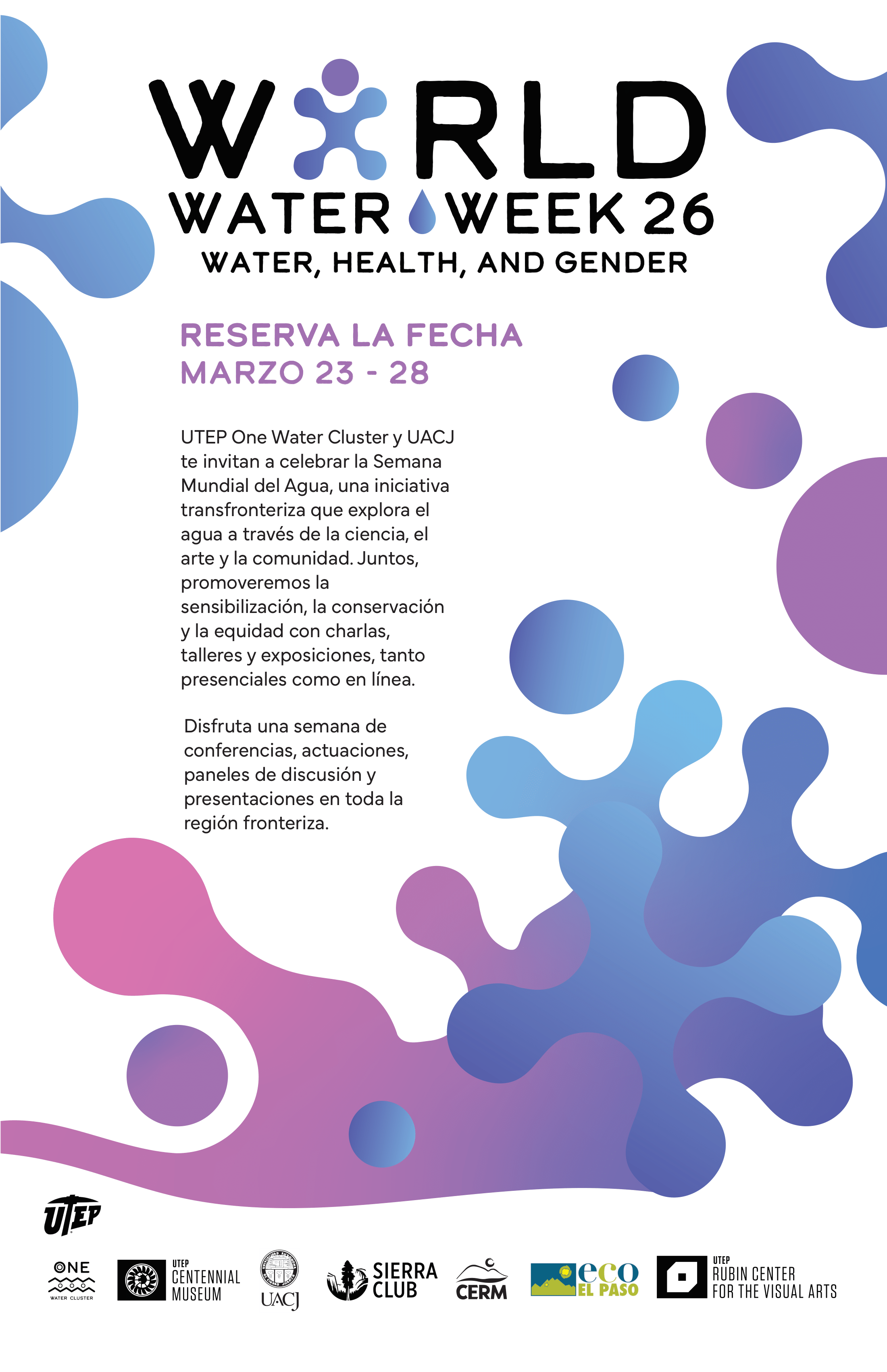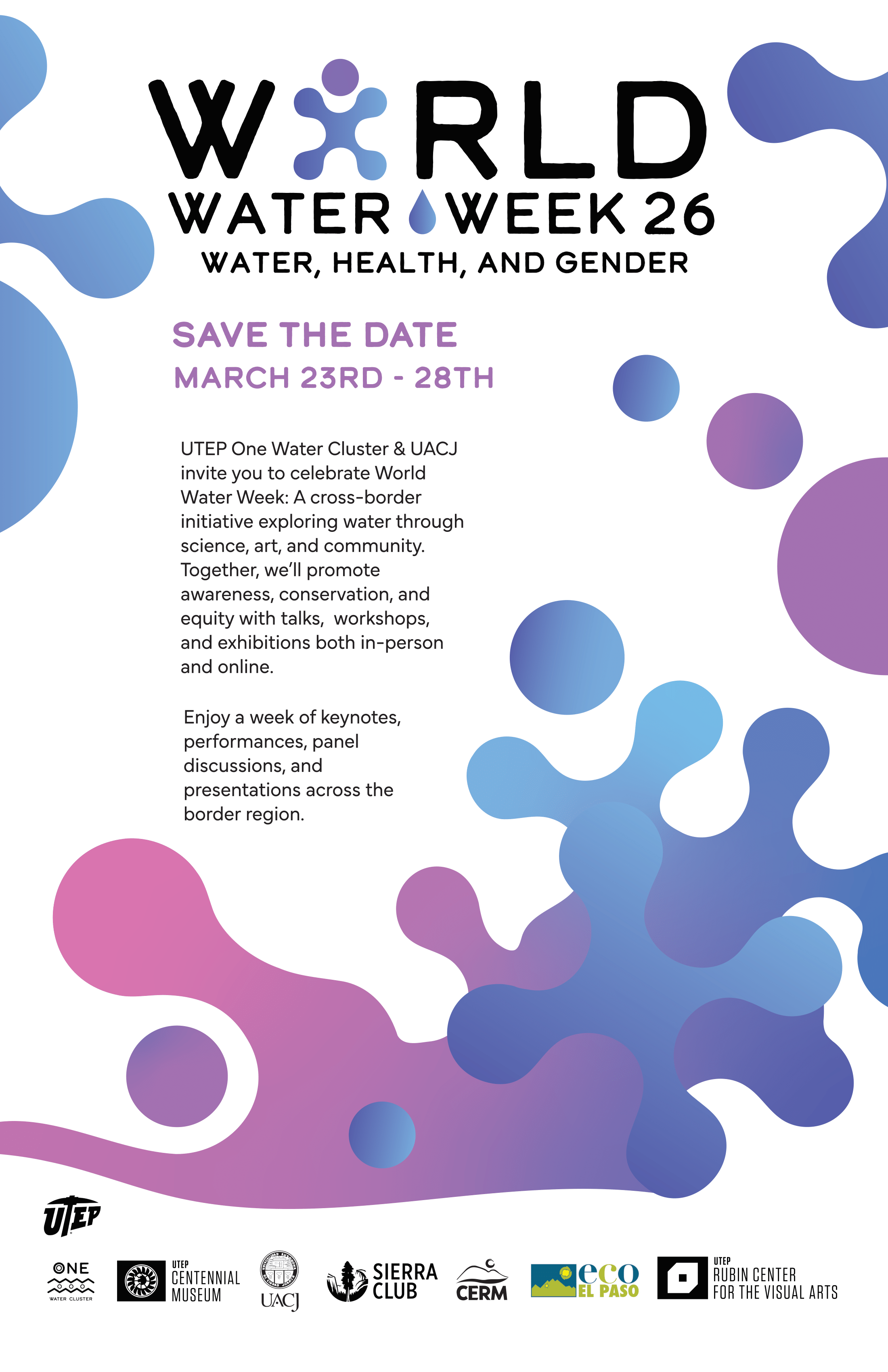 The UTEP One Water Cluster, faculty and staff at UACJ are inviting you to our annual celebration of World Water Day in March 2026. As we have for the past four years, we will celebrate with a week of interdisciplinary events. These events are designed to engage faculty, students, and community partners who are working on the issue of water from various perspectives. This creates a public platform to increase visibility of water scholarship and activism. It also provides an opportunity to develop new connections and working relationships on the topic. We expect to have a mixture of online and in-person events.