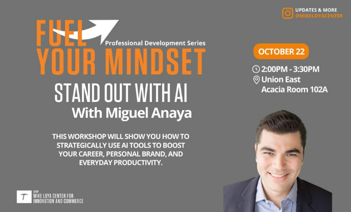 Wrap up this semester’s Fuel Your Mindset series with "Stand Out with AI", a forward-thinking workshop focused on using AI tools strategically to elevate your personal and professional journey.