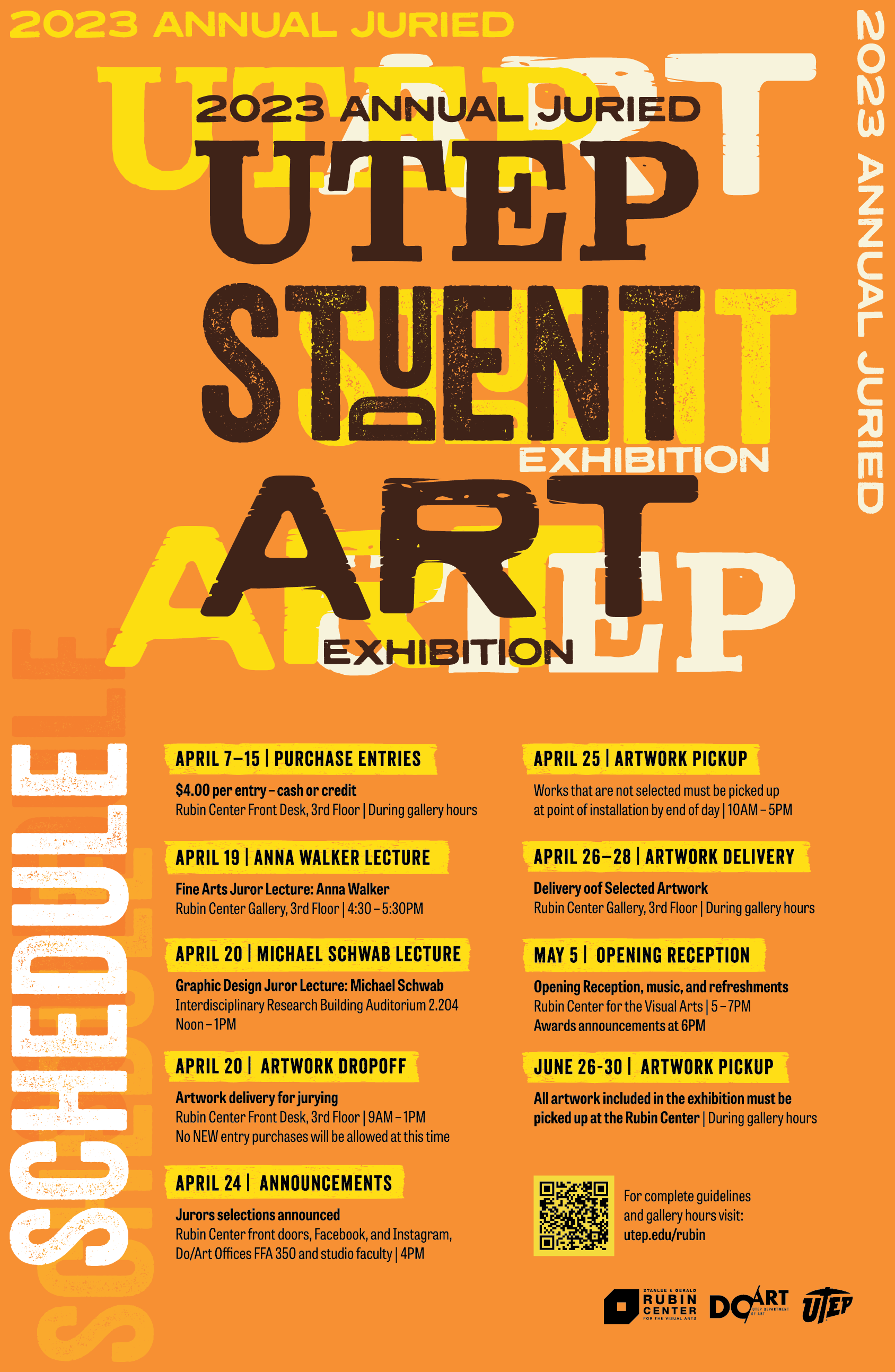 If you cannot deliver your work during these times or if you have other issues or questions related to delivery or display, please contact Rubin Center Exhibitions Coordinator Jose Krapp no later than 5pm on Friday, April 28th. You can reach him by email at jekrapp@utep.edu or by phone at 917-664-3846.
