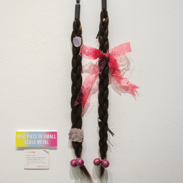 Erika Lopez, Almendra, copper, synthetic hair, paper, acrylic, nail charms, powder coat, 2024 |