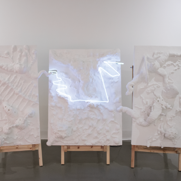 Flor Fabela, Vita Nubilosa, foam (sheet, spray), neon (argon filled), plaster, acrylic paint, 2024 |