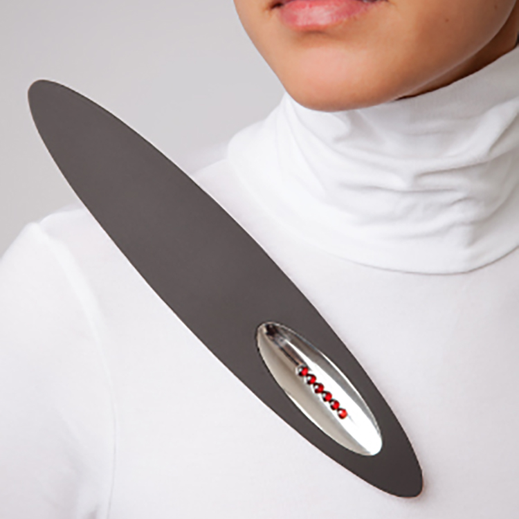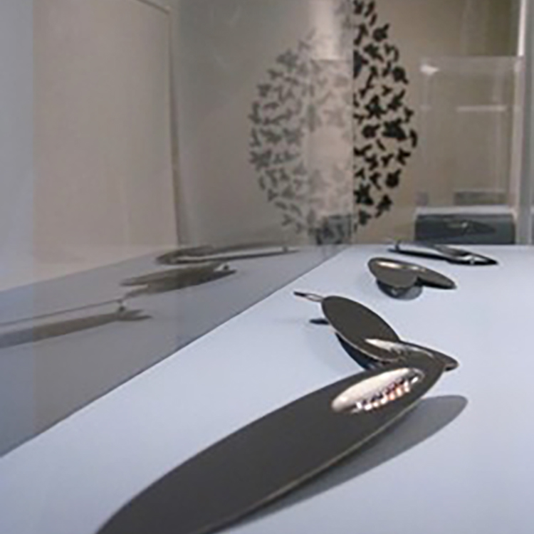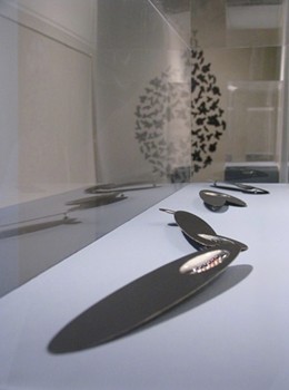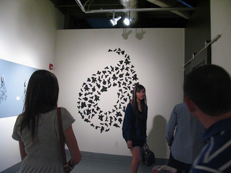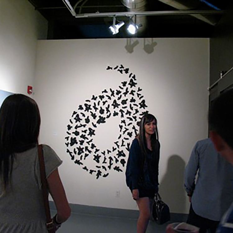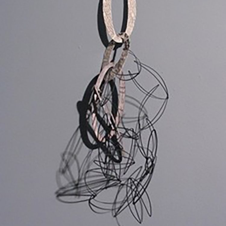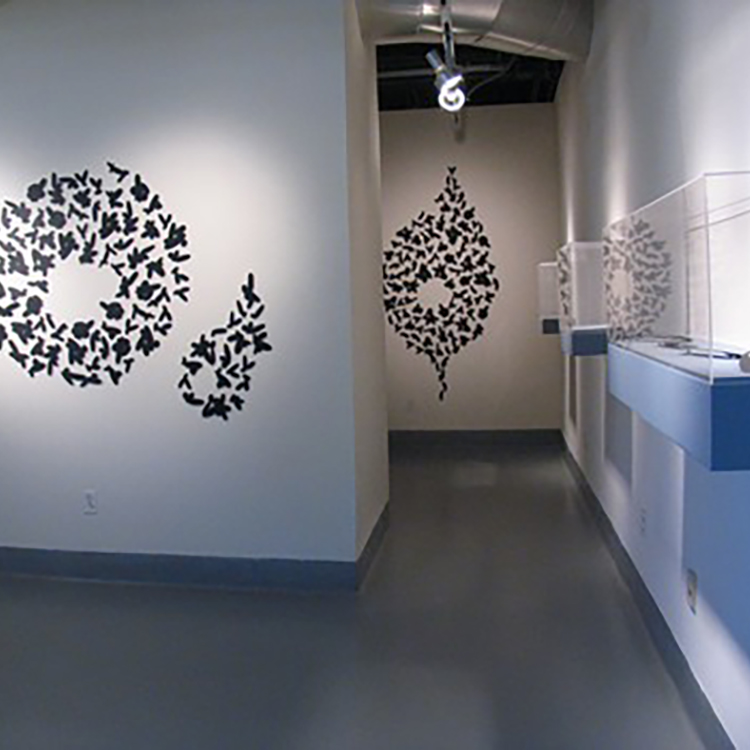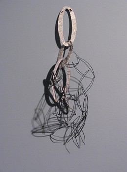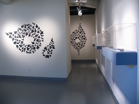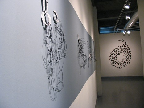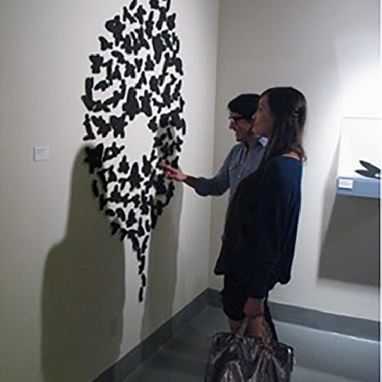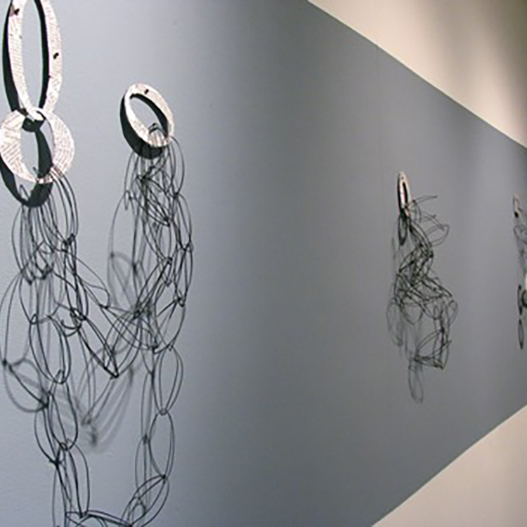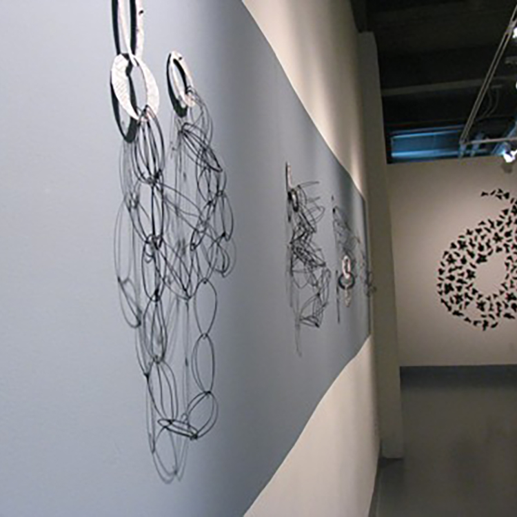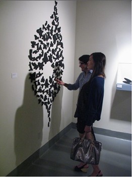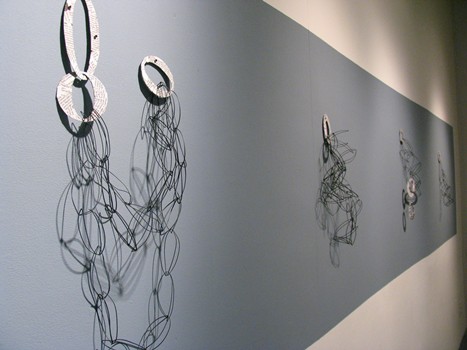 The 2012 Annual UTEP Department of Art Alumni Focus Exhibition was Eli Arenas: Middle Ground. Arenas was born in Ciudad Juárez, Chihuahua. She earned her B.F.A. From UTEP in 2002 and her MFA from New Mexico State University in 2006. Her jewelry and installation work explores the capabilities of human beings to adjust to difficult situations. Her work has been exhibited throughout the United States and Australia and is included in the collection of the Museum of Contemporary Craft in Portland, OR. It has additionally been featured in a number of publications including The Compendium Finale of Contemporary Jewelers 2008, 500 Pendants and Lockets, 500 Earrings,500 Necklaces and 1000 Rings. Eli Arenas: Middle Ground included artwork from three recent series: Middle Ground, Feeling Trapped, and How Do I Feel. The first series was comprised of mixed-media wall installations and the other two series consisted of brooches that combine semi- precious and mundane materials. Today, Arenas lives in Charlotte, NC where she maintains her studio and teaches at Winthrop University.