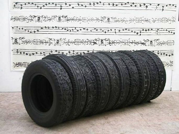 Romero’s work includes installations, object art, interventions and videos; her style mixes contemporary practices with popular art. She specializes in issues relating to contemporary Mexican and Mexican-American life including migration, gender roles, Mexican traditions, religiosity and identity, using and modifying everyday articles of global urban consumption such as tires, gum, cars and tattoos. Her artwork, installations and interventions are a reflection on the contradictions of modernity.