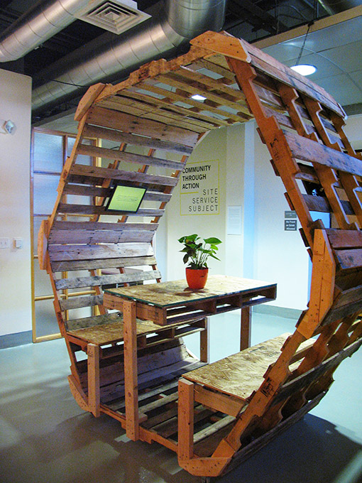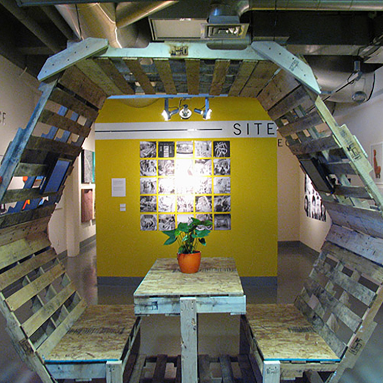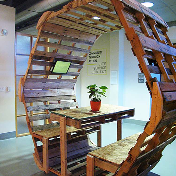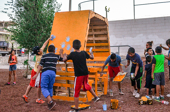 Nómada Laboratorio Urbano is a collective of experimental agents in the border region made up of social architect, photographer, co-founder, and collective director Miguel Mendoza M., co-founder and researcher Evangelina Cordero, co-founder and sociologist Andrés Mendoza, cultural manager Miguel Mendoza R., sociologist Génesis Rodríguez and photographer and researcher Erick García. The group, primarily active in the city of Juarez, works with the community as active agent in its urban and social context seeking the consolidation of urban space and citizen. This approach features an interdisciplinary activism that fosters the creation and development of cultural projects often executed in a “pop up” style. Another distinctive characteristic of the collective is the use of pallets to create recycled structures under the method of tactical urbanism and “upcycling.”