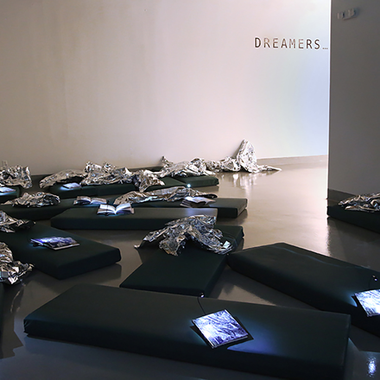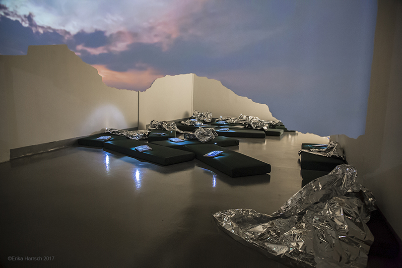 This video and sound installation is an homage to the children who try to cross borders to start a new life with or without their parents, and to all the parents who dream of better opportunities and a safer life. The elements that compose the piece, evoke the relativity of the physical space and territories, delimited by artificial geopolitical borders, although under the same sky. The floating screen that divides the space as a borderline. To enter the other side of the room that insinuates a holding cell at a U.S. Customs and Border Protection processing facility, (based on the first images revealed in 2014 of the Texas detention centers for unaccompanied, undocumented minors).