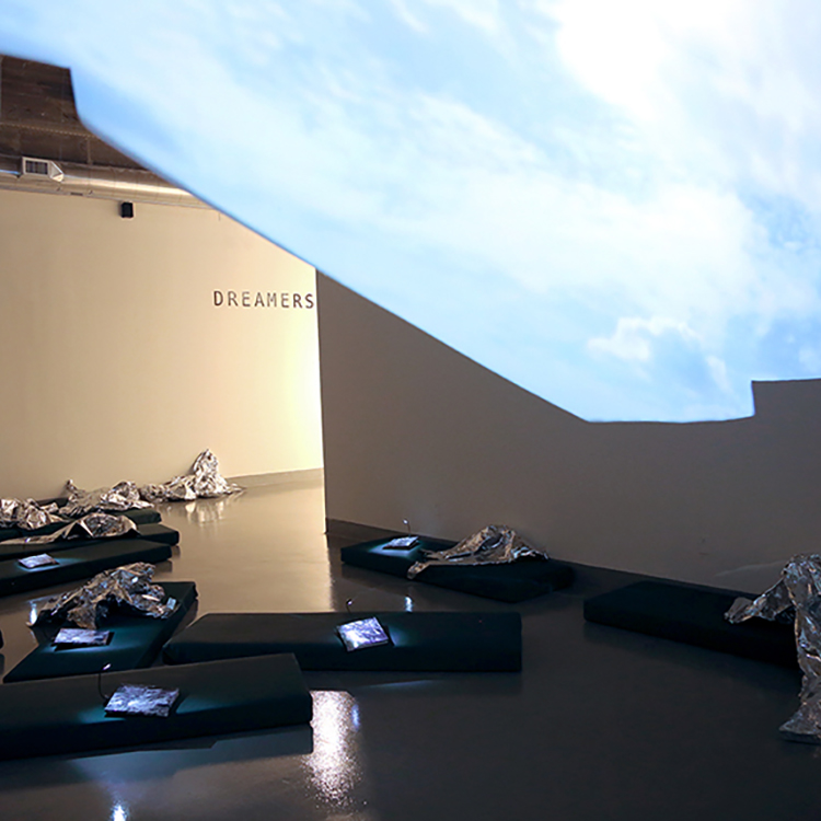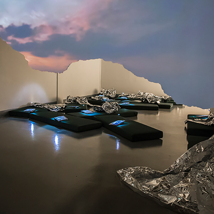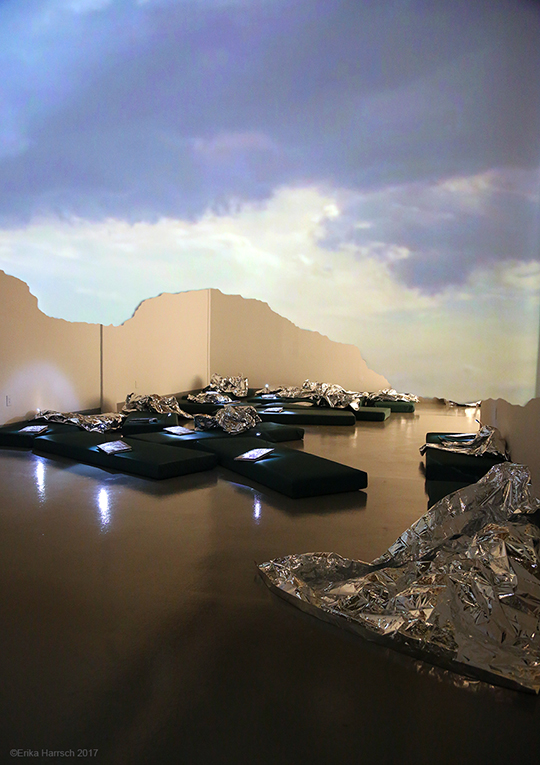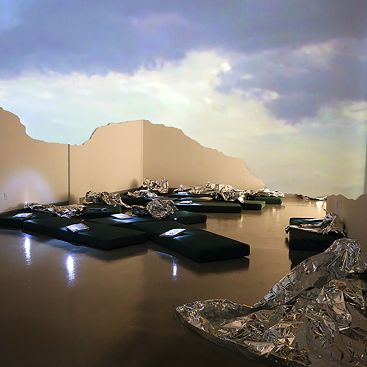 The video projection of the sky, visible from both sides of the hanging screen, has been sculpted to the contours of the US-Mexico borderline. Visitors who pass under the screen will encounter a series of military-style mattresses and Mylar blankets, exactly like those used by Immigration and Customs Enforcement (ICE) in detention centers housing undocumented minors who have been caught trying to enter the country illegally.