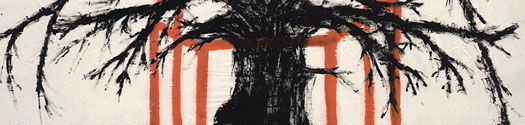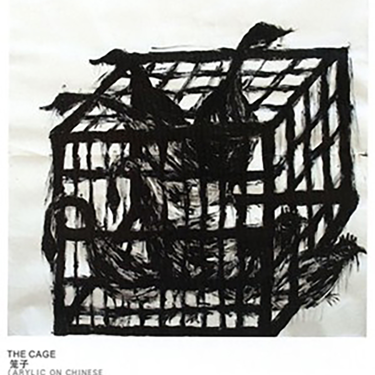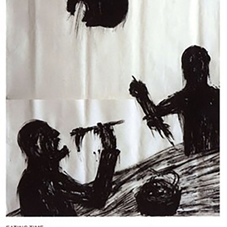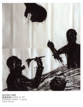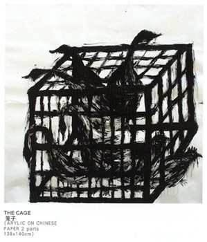 The largely black and white images showed an Asian influence with shadowy pictures of caged geese like those found in Chinese markets, silhouettes of men filling their wide open mouths with chopsticks and the dripping limbs of a willow tree. Henriquez also created a site-specific mural in black acrylic on the wall of the Project Space Gallery.