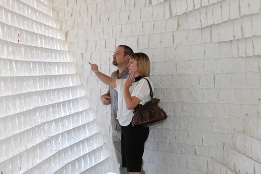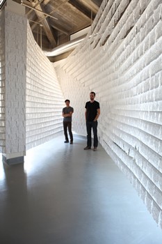 Jay Atherton and Cy Keener are principles of the design firm Atherton/Keener and are based in Phoenix, Arizona. Each earned a graduate degree in architecture from the University of California, Berkeley. They visited El Paso for the first time in September 2010 to discuss the possibility of reshaping one of the galleries in the Rubin Center to express one or many of the unique qualities of the site. Initially they thought in depth about the U.S./Mexico border and how to respond to it. But within a few weeks they decided that approach was, in the words of Atherton, too directly about construction; we were missing the big picture. Instead we wanted to ask questions about commerce and history and how light is a mixture of colors reflected from objects around us. Keener adds, We did not really want to address architectural space but rather that which is not knowable.