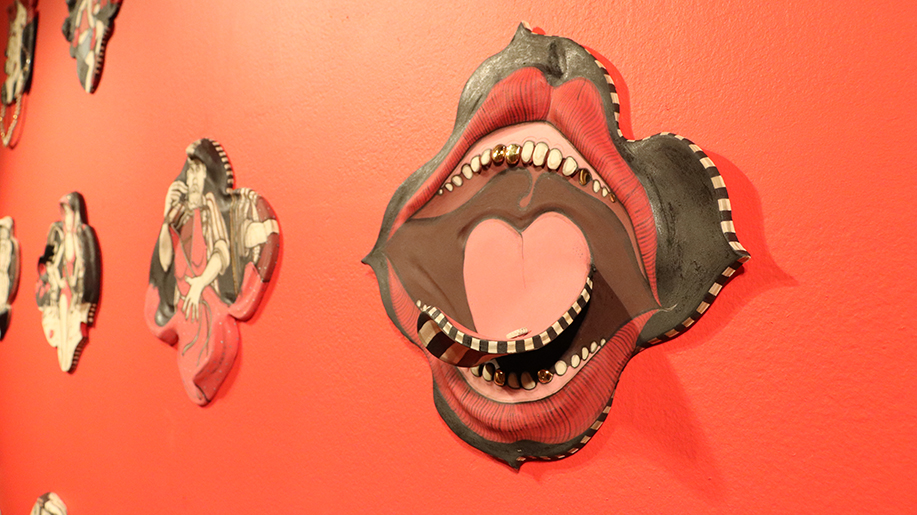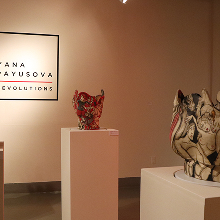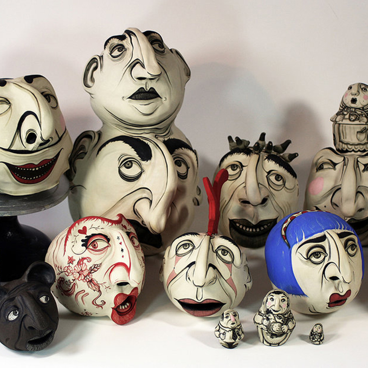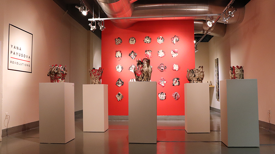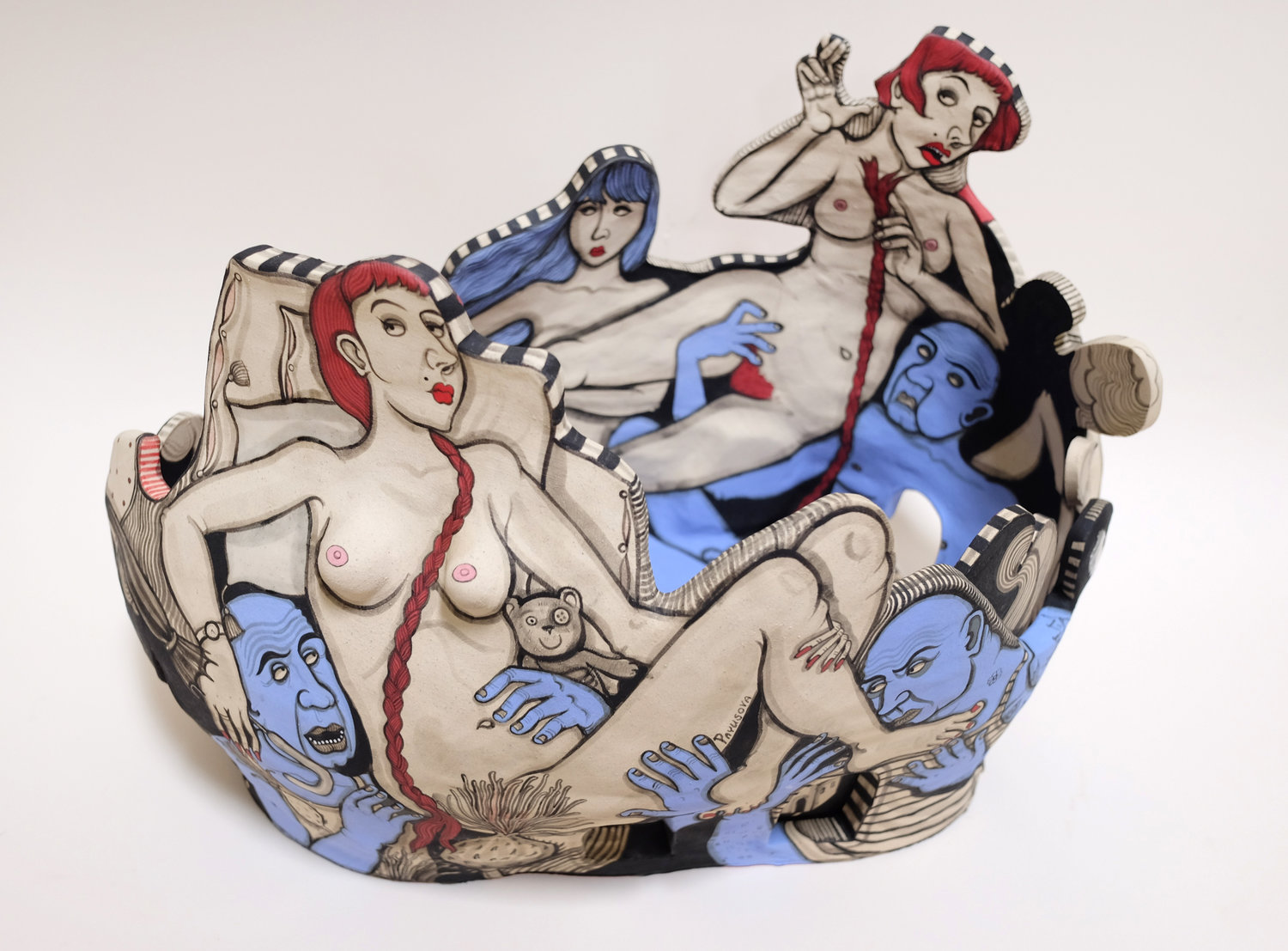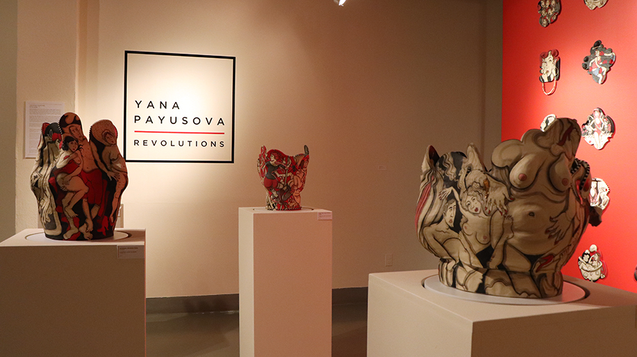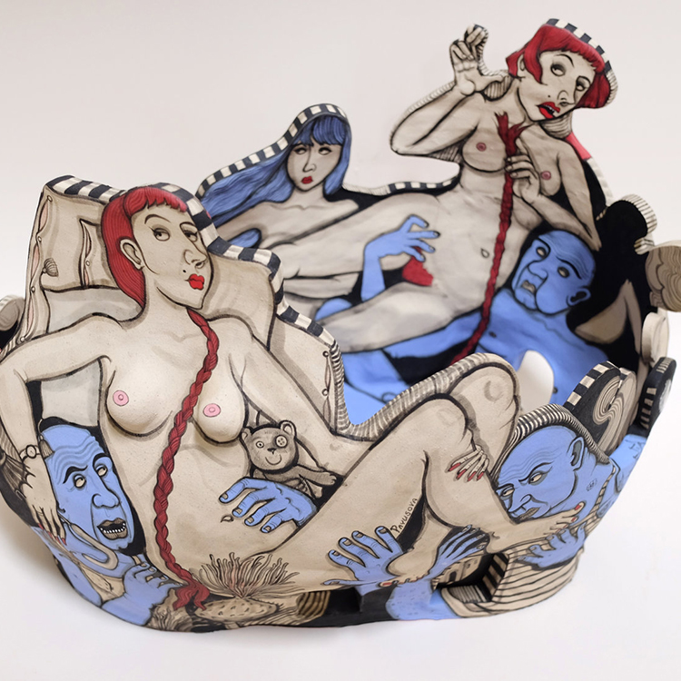 The renderings on the surfaces are informed by Akio Takamori sculptures, Soviet propaganda posters, the early Will Eisner comics, the wordless woodcut novels of the 1920s, the Ancient Greek orgy cups and the Japanese Ukiyo-e prints. The tropes and allusions presented in the works cannot be separated from the ongoing debate over female body rights concerning birth/abortion, circumcision, body coverage/exposure, contraception, and obligations within matrimony. Throughout history, the unclothed female figure has carried the baggage of objectification, voyeurism, exoticism, desire, and struggle for power and control. Inspired by her cultural heritage and training in traditional Russian realist painting, Payusova also presents a selection of her earlier works that blend the styles of folk art, Russian icons, graphic poster art, illustration and comics that narrate a magic realism through the symbolic and allegorical characters that thread throughout her work.