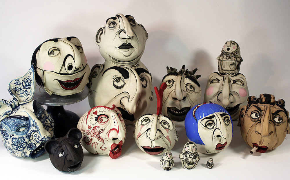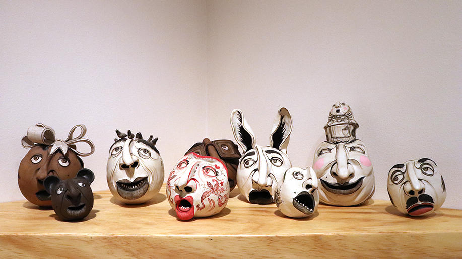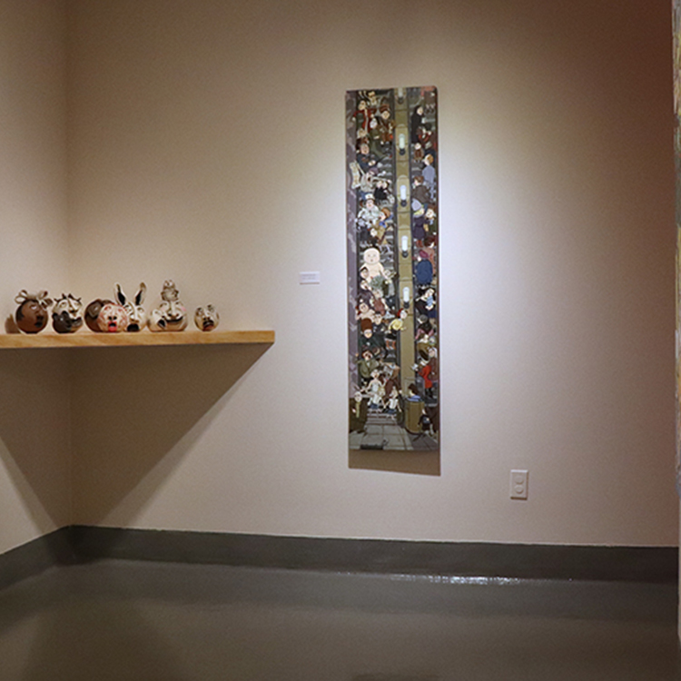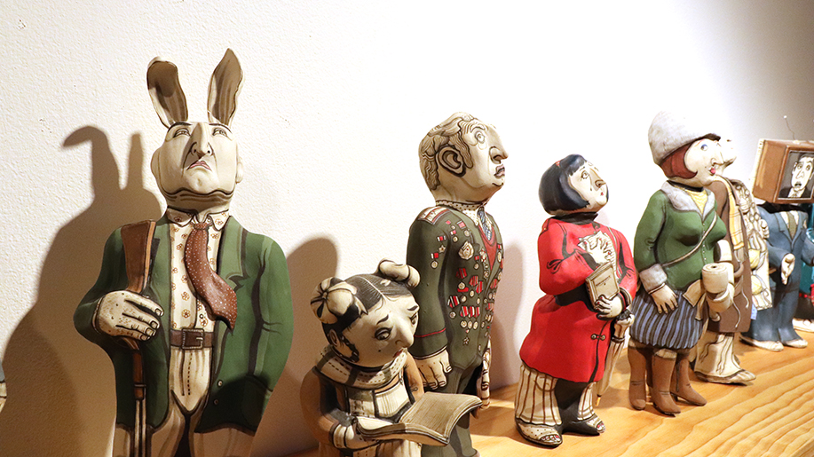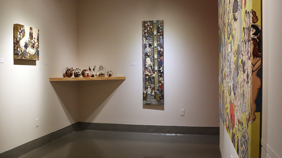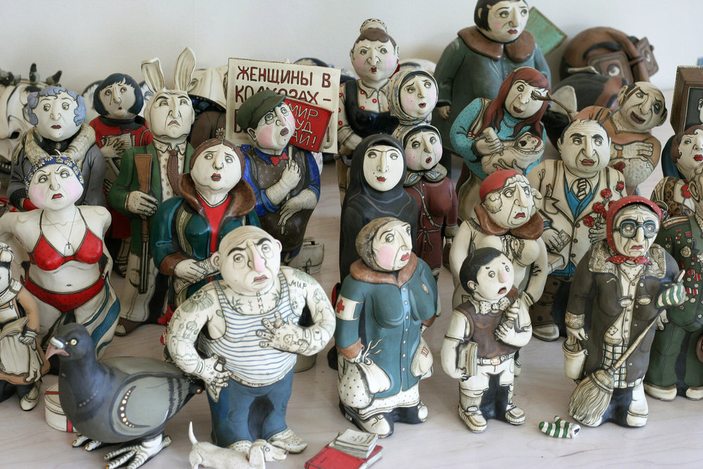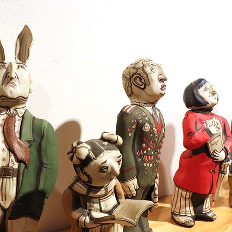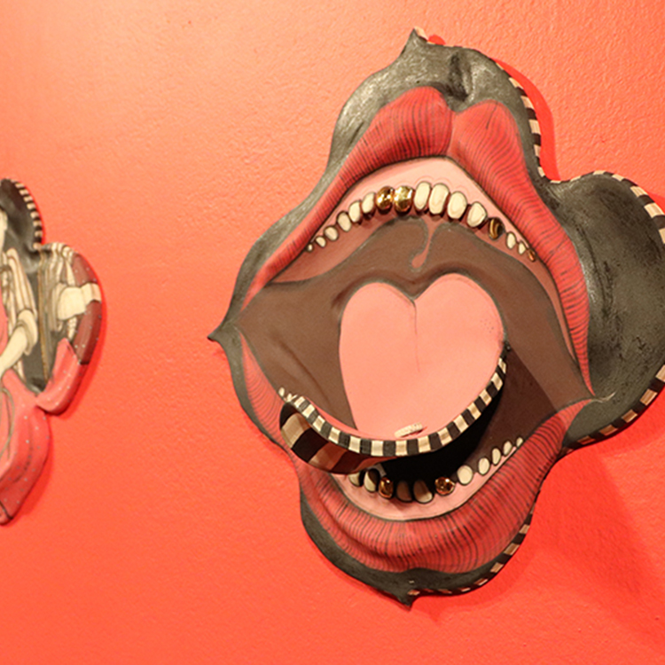The renderings on the surfaces are informed by Akio Takamori sculptures, Soviet propaganda posters, the early Will Eisner comics, the wordless woodcut novels of the 1920s, the Ancient Greek orgy cups and the Japanese Ukiyo-e prints. The tropes and allusions presented in the works cannot be separated from the ongoing debate over female body rights concerning birth/abortion, circumcision, body coverage/exposure, contraception, and obligations within matrimony. Throughout history, the unclothed female figure has carried the baggage of objectification, voyeurism, exoticism, desire, and struggle for power and control. Inspired by her cultural heritage and training in traditional Russian realist painting, Payusova also presents a selection of her earlier works that blend the styles of folk art, Russian icons, graphic poster art, illustration and comics that narrate a magic realism through the symbolic and allegorical characters that thread throughout her work.