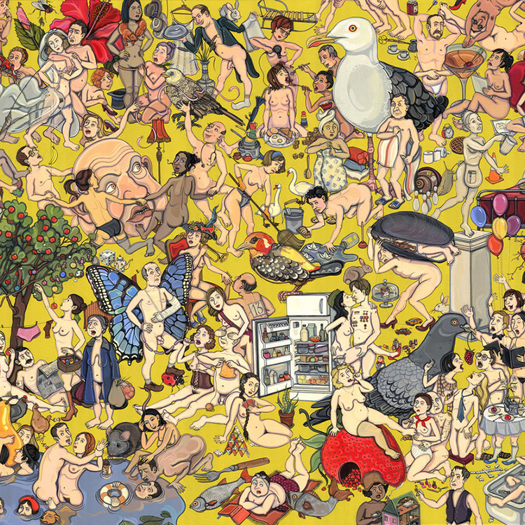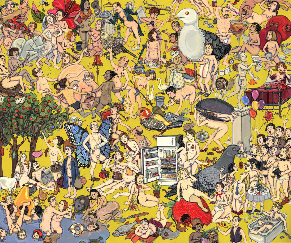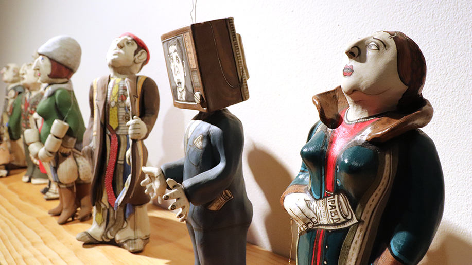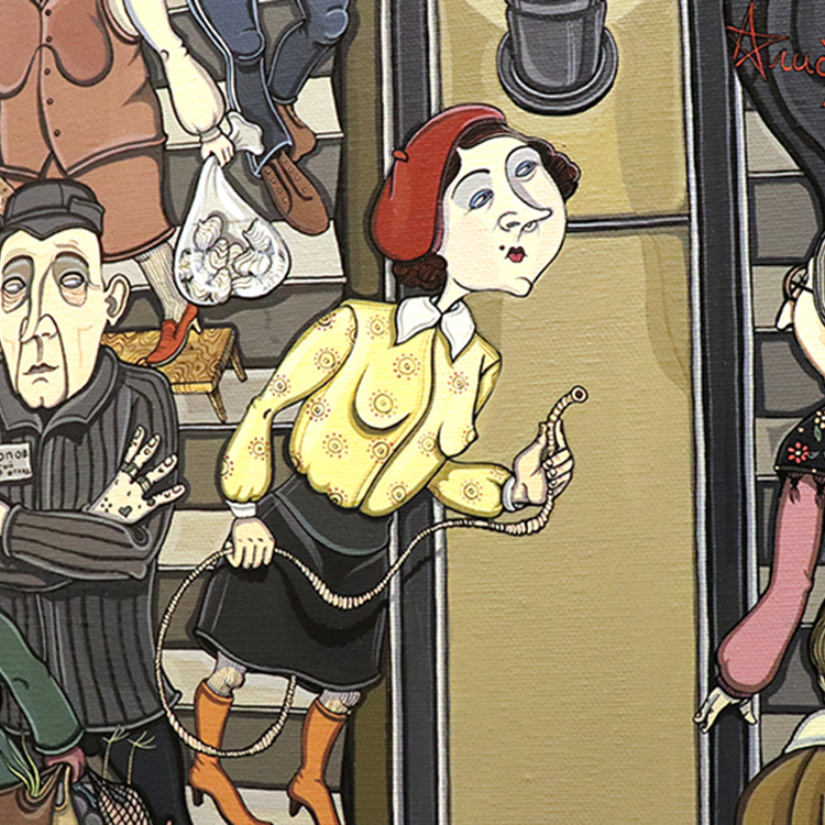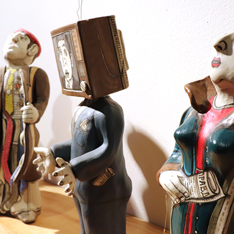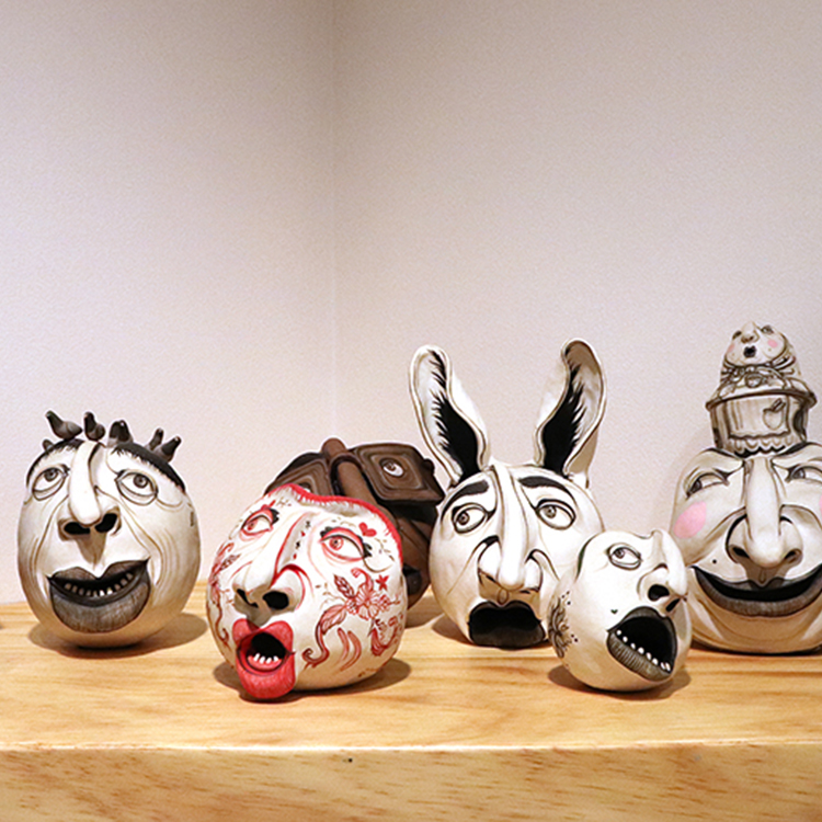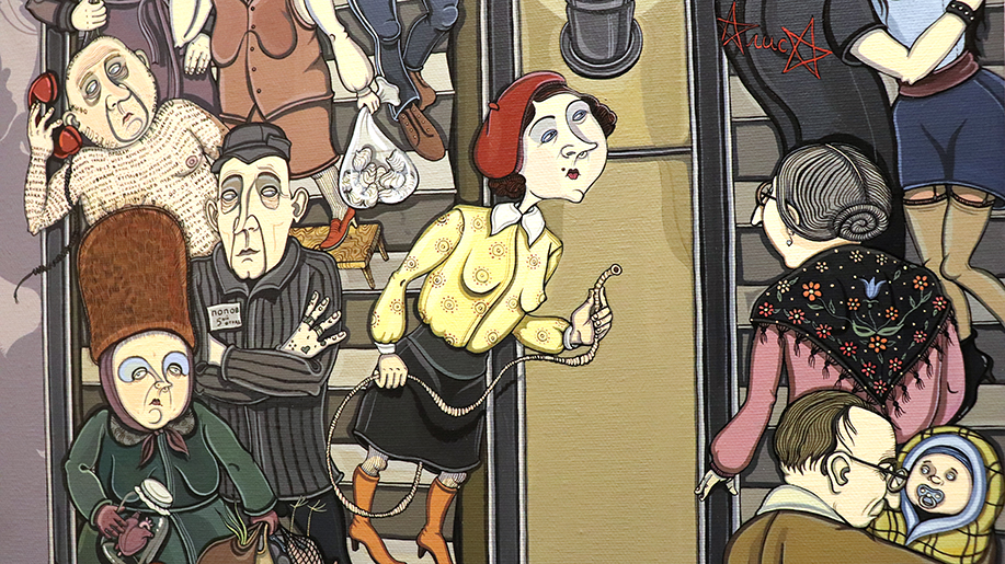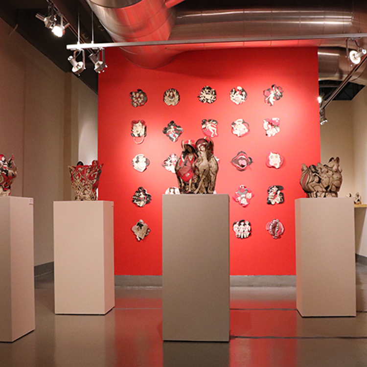 The renderings on the surfaces are informed by Akio Takamori sculptures, Soviet propaganda posters, the early Will Eisner comics, the wordless woodcut novels of the 1920s, the Ancient Greek orgy cups and the Japanese Ukiyo-e prints. The tropes and allusions presented in the works cannot be separated from the ongoing debate over female body rights concerning birth/abortion, circumcision, body coverage/exposure, contraception, and obligations within matrimony. Throughout history, the unclothed female figure has carried the baggage of objectification, voyeurism, exoticism, desire, and struggle for power and control. Inspired by her cultural heritage and training in traditional Russian realist painting, Payusova also presents a selection of her earlier works that blend the styles of folk art, Russian icons, graphic poster art, illustration and comics that narrate a magic realism through the symbolic and allegorical characters that thread throughout her work.