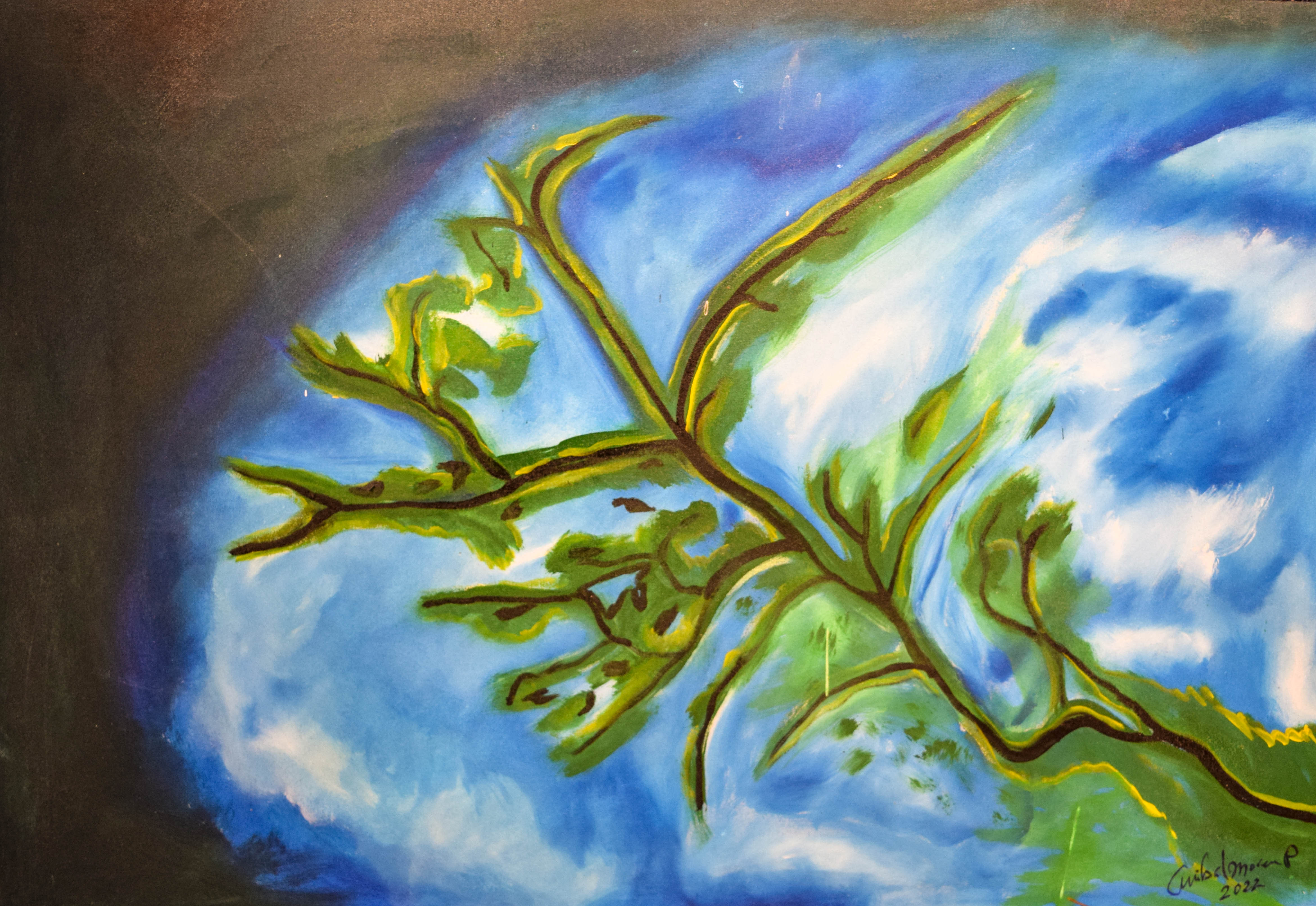La transpiración, la pérdida de agua a través de los poros de las hojas, es uno de los componentes más importantes del ciclo del agua. Esta pintura muestra el vapor de agua menos denso que se eleva hacia la atmósfera y se condensa en las nubes en el fondo.
