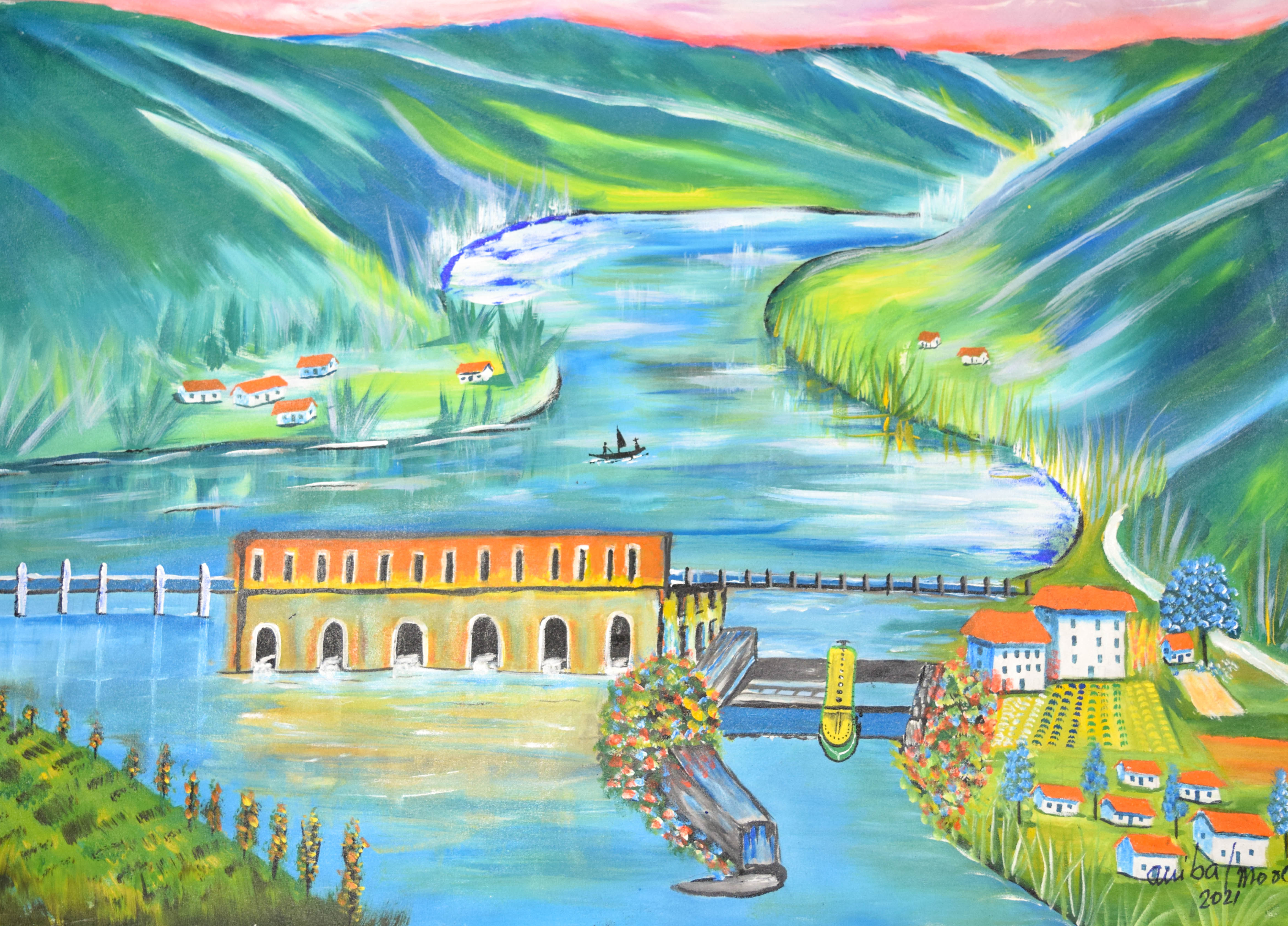 The Danube River, Europe’s second longest river, begins in the Black Forest of southwestern Germany and travels through ten countries before draining into the Black Sea. The painting depicts a control structure, used for water management, constructed across the Danube. This barrage, a dam with gates, controls the water’s direction, its rate of flow, or maintains a desired water surface elevation.