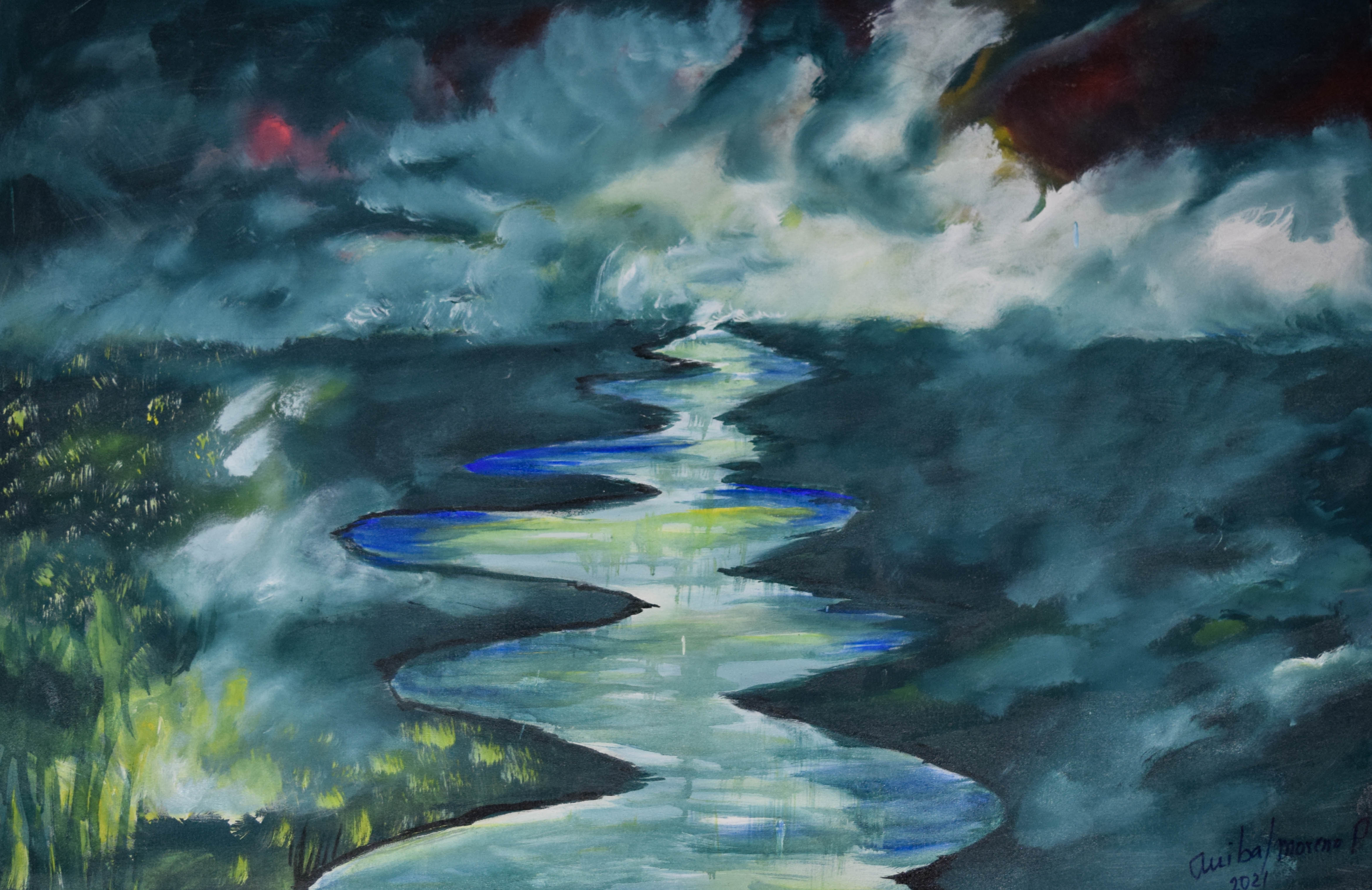 En esta pintura, el artista representa los atardeceres multicolor a lo largo del valle del río Cauca, en Colombia. Estos colores vivos son el resultado de la dispersión de Mie, la dispersión de partículas atmosféricas provocada por una alta concentración de vapor de agua, polvo, polen o humo.
